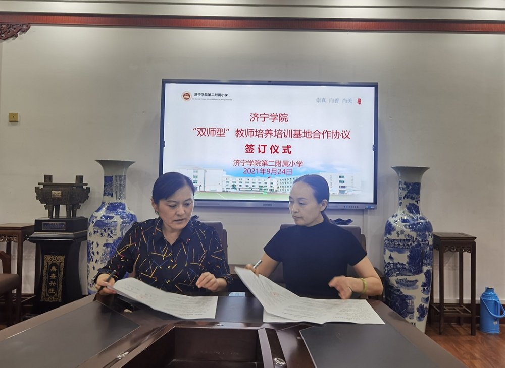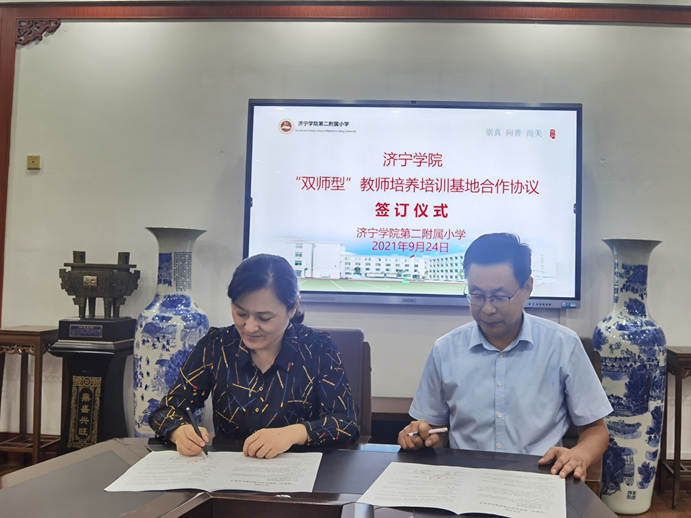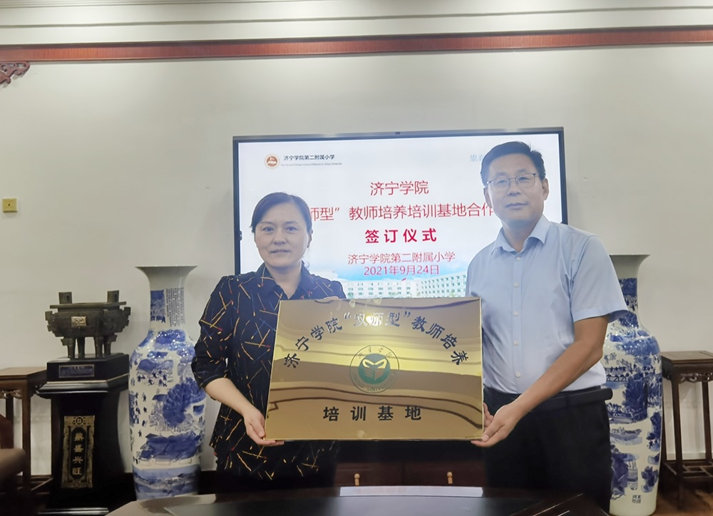 9月24日,教师教育学院“双师型”教师培养培训基地合作签约授牌仪式在济宁学院第二附属小学隆重举行。教师教育学院院长李群、院党委书记乔东华、副院长曹光海、单清清、挂职锻炼教师郑程月和李丹丹,济宁学院第二附属小学校长苏明、副校长高喆、幼儿园园长侯丽出席了签约授牌仪式。李群院长与济宁学院第二附属小学苏明校长、侯丽园长分别签署了济宁学院“双师型”教师培养培训基地合作协议。