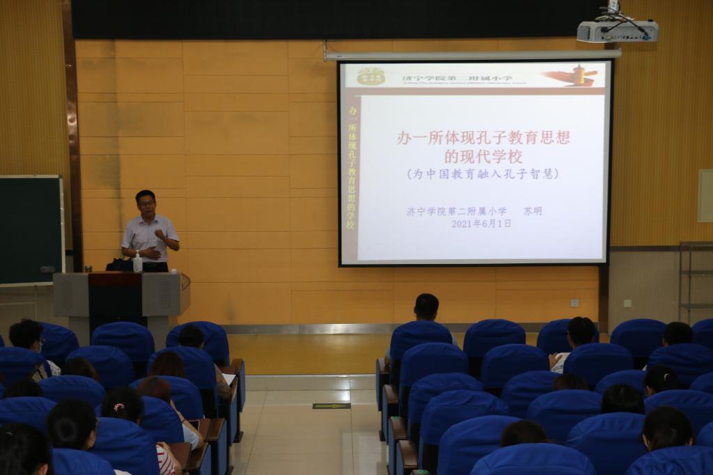 苏明介绍了济宁学院第二附属小学的百年历程及发展探索,阐释了“办一所体现孔子教育思想的现代学校”这一办学理念确立的缘由及价值;提出要将孔子教育思想通过六大途径融入学校文化、课程改革、班级管理、学生生活、教师发展并充分利用好社会、家乡资源,打造“传统文化进校园十大行动”;并展示了济宁学院第二附属小学独具特色的“少年君子”传统文化教育活动,让学生直观感受了二附小浓厚的儒雅之风。