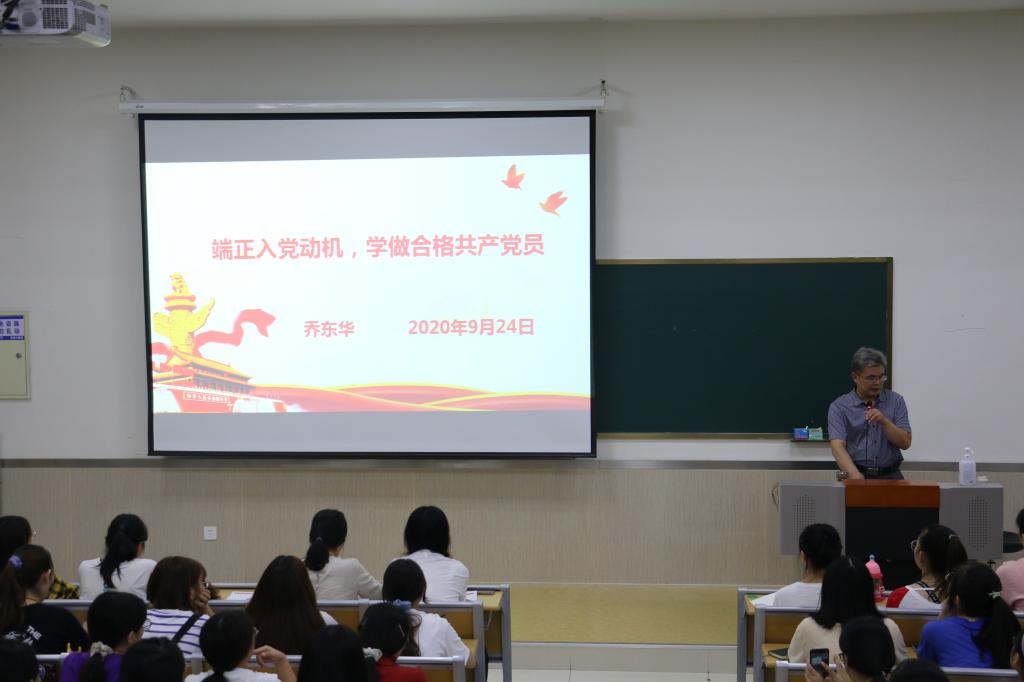 2020年9月24日晚,教育系在2号楼B202开展了第39期入党积极分子普遍培训,教育系党总支书记乔东华为二百余位入党积极分子讲党课。