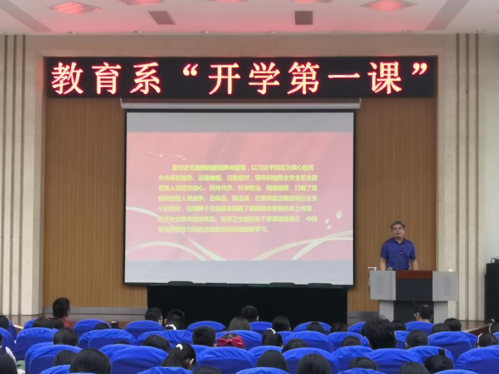 为使学生尽快适应全面复学和疫情防控的“新常态”,提高疫情防护意识,厚植爱国主义情怀,根据学校《2020年秋季学期疫情防控暨开学工作方案》和《关于上好2020年秋季学期“开学第一课”的通知》要求,9月7日---9月11日,教育系党总支书记乔东华通过线上线下相结合的方式,为全系1000多名学生上了“开学第一课”。