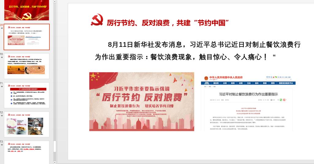 为深入贯彻习近平总书记关于坚决制止餐饮浪费行为,切实培养节约习惯,在全社会营造“浪费可耻、节约为荣”的氛围的重要指示精神, 9月10日下午,系教工党支部在会议室召开了“厉行节约、反对浪费、共建节约中国”的主题党日活动。
