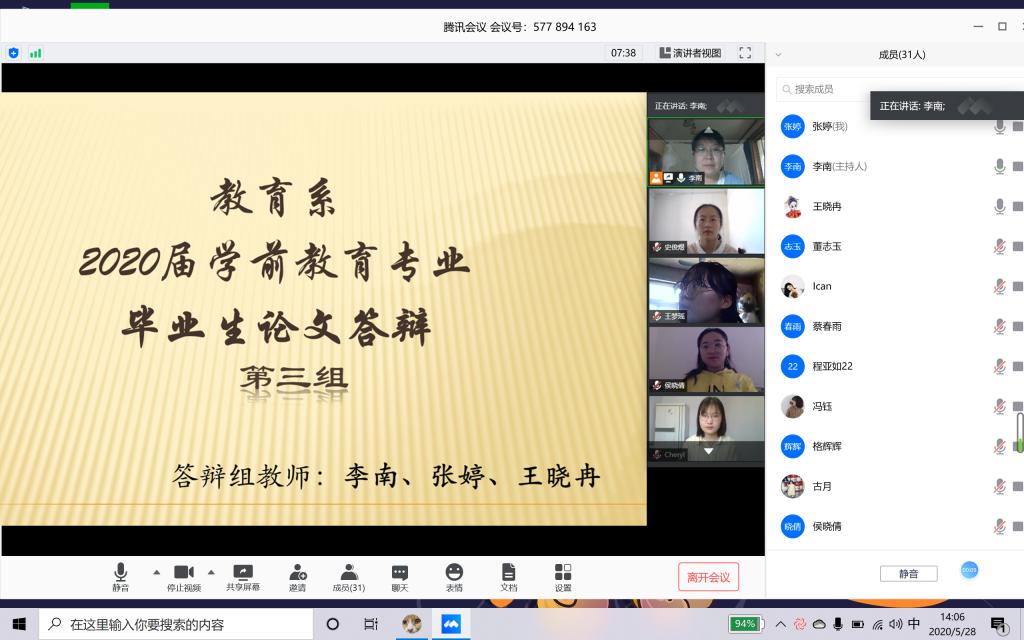 2020年5月28日下午14:00,教育系44位论文答辩老师与心理学、小学教育、学前教育三个专业共310名学生相约相聚在云端,正式开启2020届本科毕业生论文答辩工作。本次线上答辩三个专业共14个小组同时进行,每个小组由3名2017级学生参与旁听,并负责答辩记录和其他服务工作。