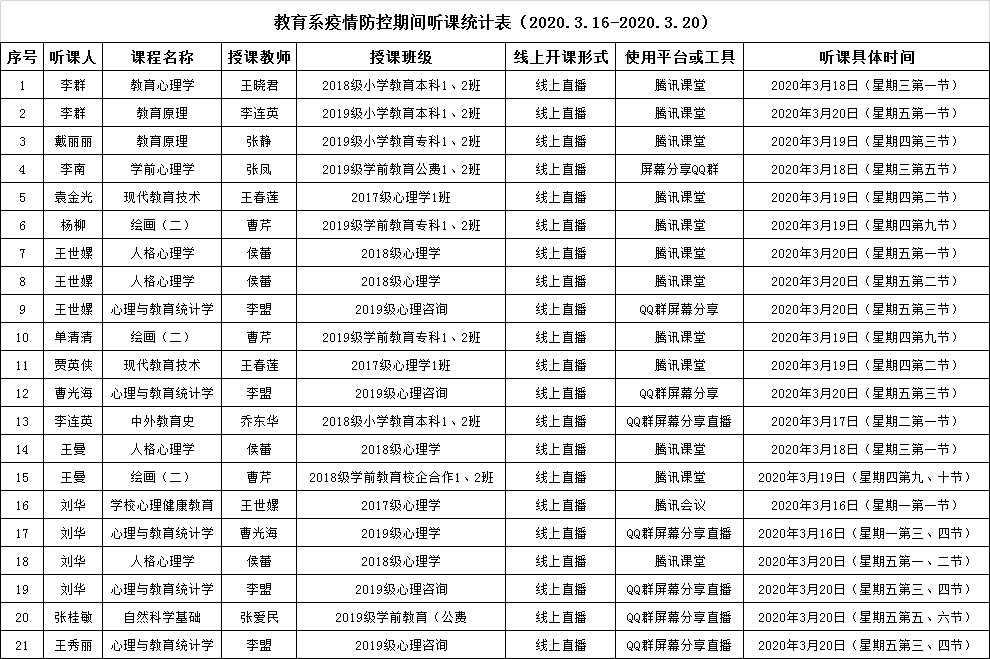 为进一步提升线上教学质量,教育系在第一时间研究督导方案,调整督导方式。自3月16日起,本系开启线上教学听课评课活动。活动要求系内相关人员开展听评课的督导检查,鼓励所有教师进行听评课的相互学习。截至目前,系领导、教学督导、教研室主任听评课共计57门,其他教师听评课共计十余门。教育系已形成良好的在线听评课教学质量监控生态环境。