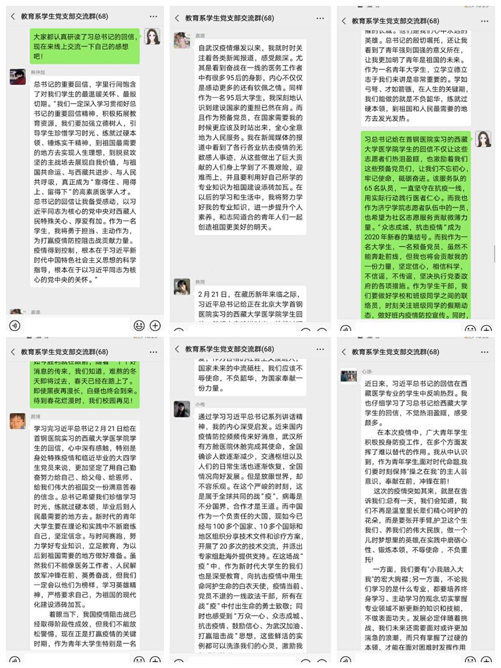 2月21日,在藏历新年来临之际,习近平总书记给正在北京大学首钢医院实习的西藏大学医学院学生回信,希望大家珍惜时光,练就过硬本领,毕业后到人民最需要的地方去,以仁心仁术造福人民。3月22日,教育系学生党支部组以专题视频交流会的形式,集体学习习近平总书记给在北京大学首钢医院实习的西藏大学医学院学生回信精神。