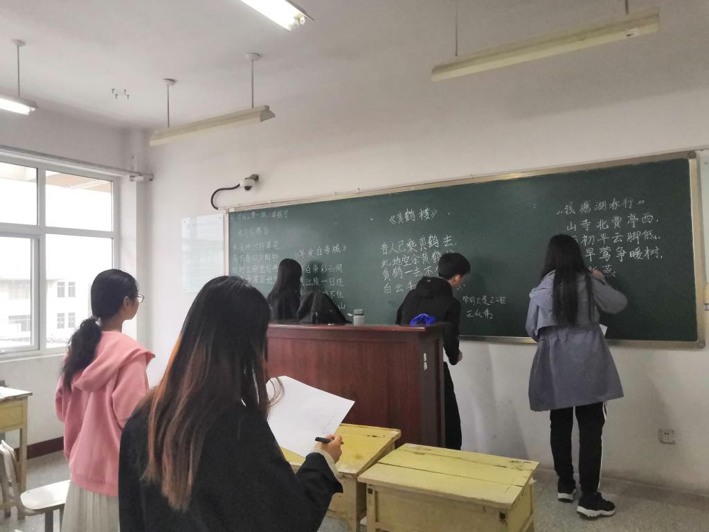 本次粉笔字比赛,需要选手们将备好的题材抄写在黑板上。比赛前,同学们做了充分的准备,比赛过程中,选手们全神贯注地在的黑板上挥洒书写之豪情。同学们不急不躁,完全沉浸在自己的书法世界。一点一横,一撇一捺,无一不透露着书写者的儒雅气质。选手们的粉笔字各具特色,洒脱大气、遒劲刚毅、飘逸舒展。选手完成作品后,将作品统一进行展览,评委们现场给同学们打出了评分。