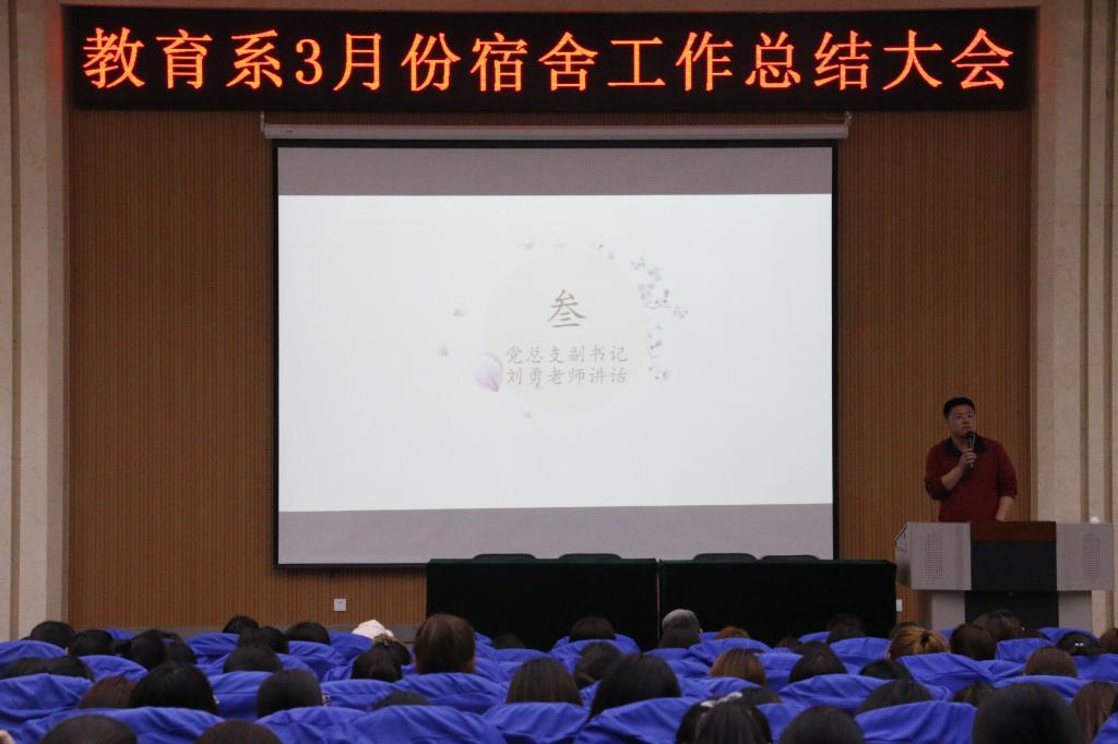 2019年4月15日16时30分,教育系在3号楼报告厅举办行“教育系三月份宿舍工作总结大会”。教育系党总支书记乔东华,党总支副书记刘勇,团总支书记杜鹃,辅导员徐艳艳、田翠出席了本次会议。