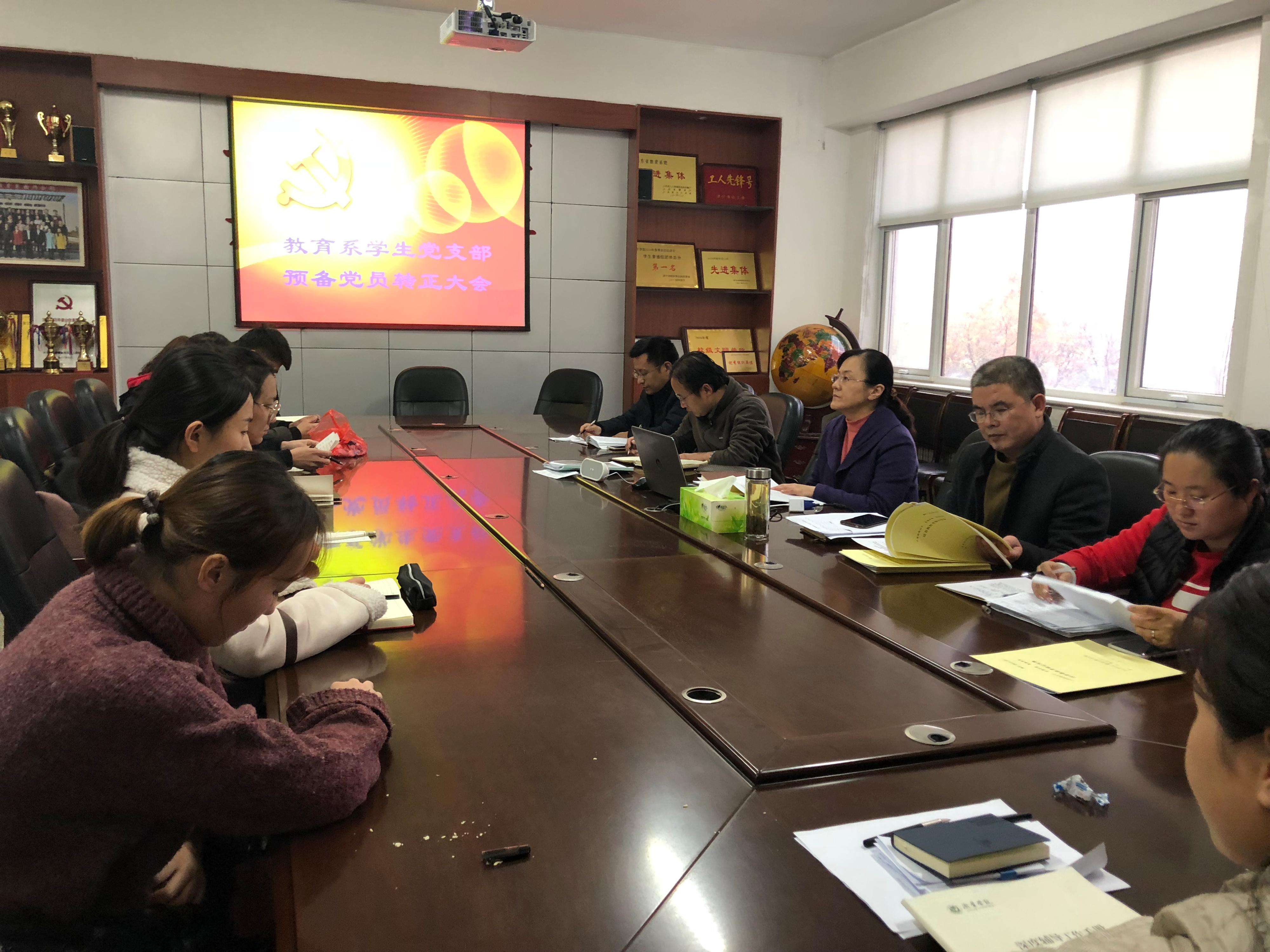 根据会议流程,首先,由申请转正的12名预备党员依次发言,对预备期一年的工作、生活、学习、思想等情况进行总结汇报。每位预备党员发言后,入党介绍人分别介绍了申请人在一年预备期的表现并表明自己的态度。在充分讨论的基础上,经依次无记名投票表决,12名同志均全票通过转为中共正式党员。最后,教育系党总支书记乔东华对此次会议进行了总结。他对12名按期转正的同志表示了衷心的祝贺并给予殷切期望,要求同志们要发挥党员的先锋模范带头作用,带动周围的人共同进步,要不忘初衷、不失本心,做一名合格的共产党员。