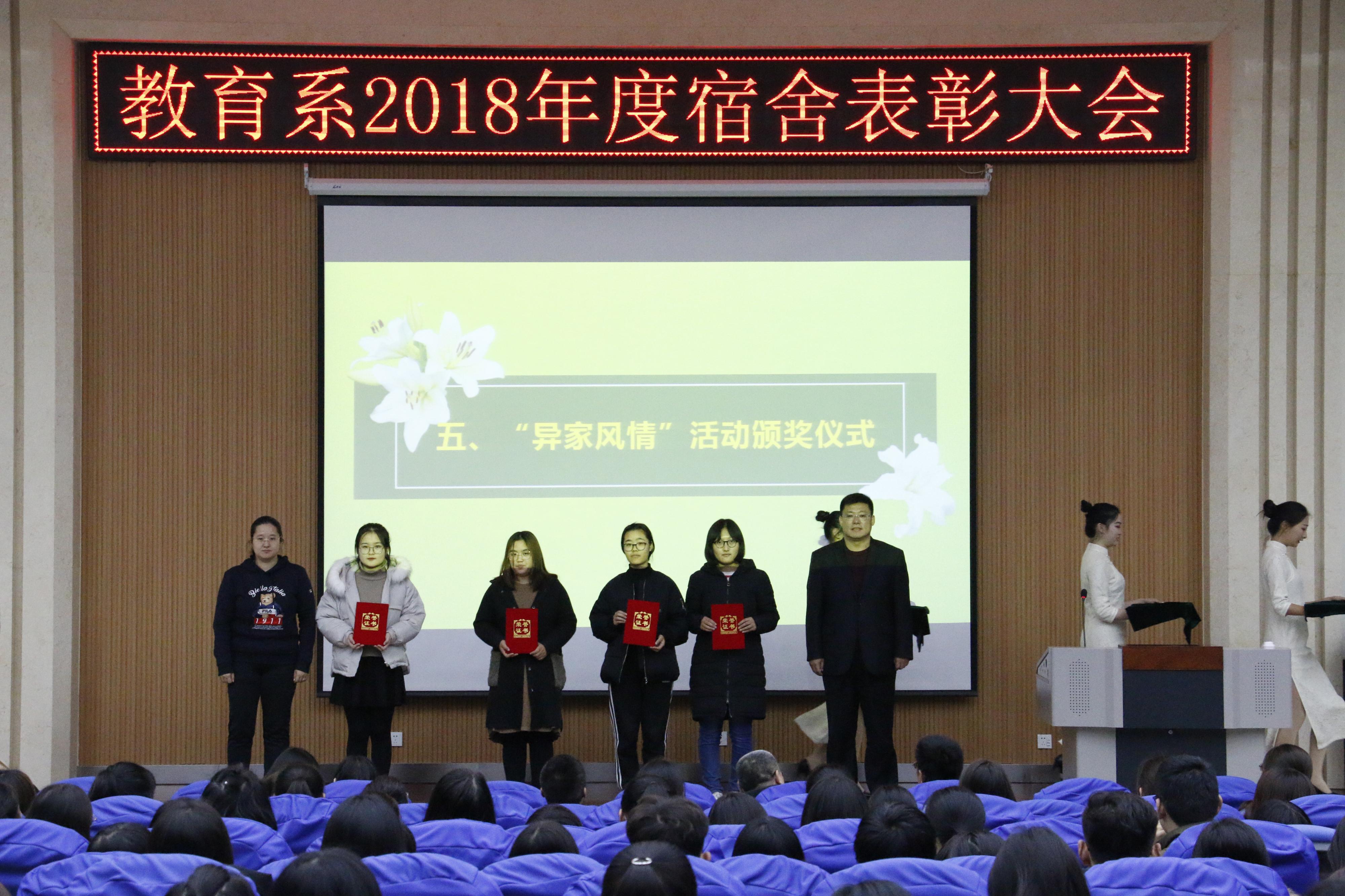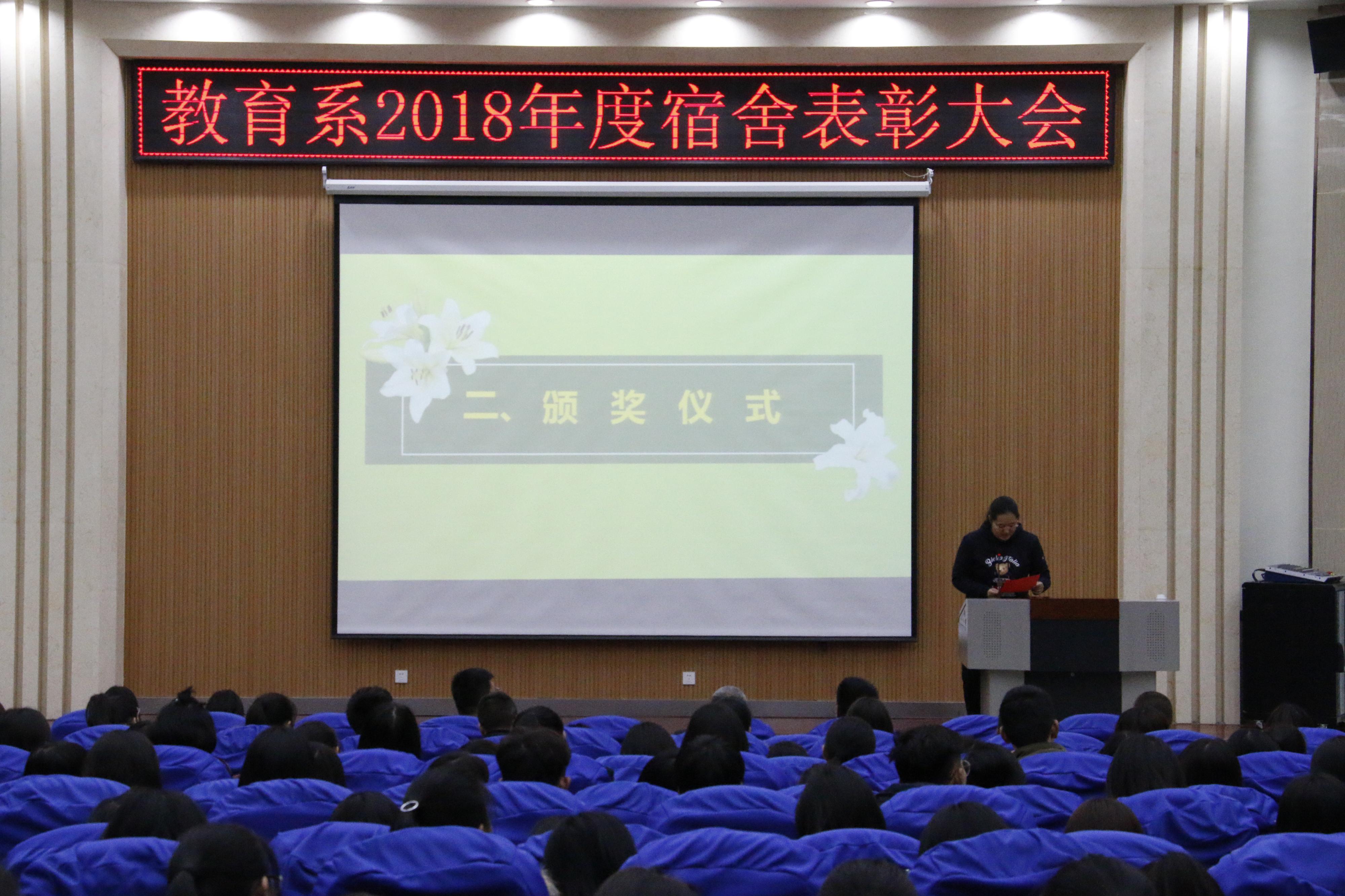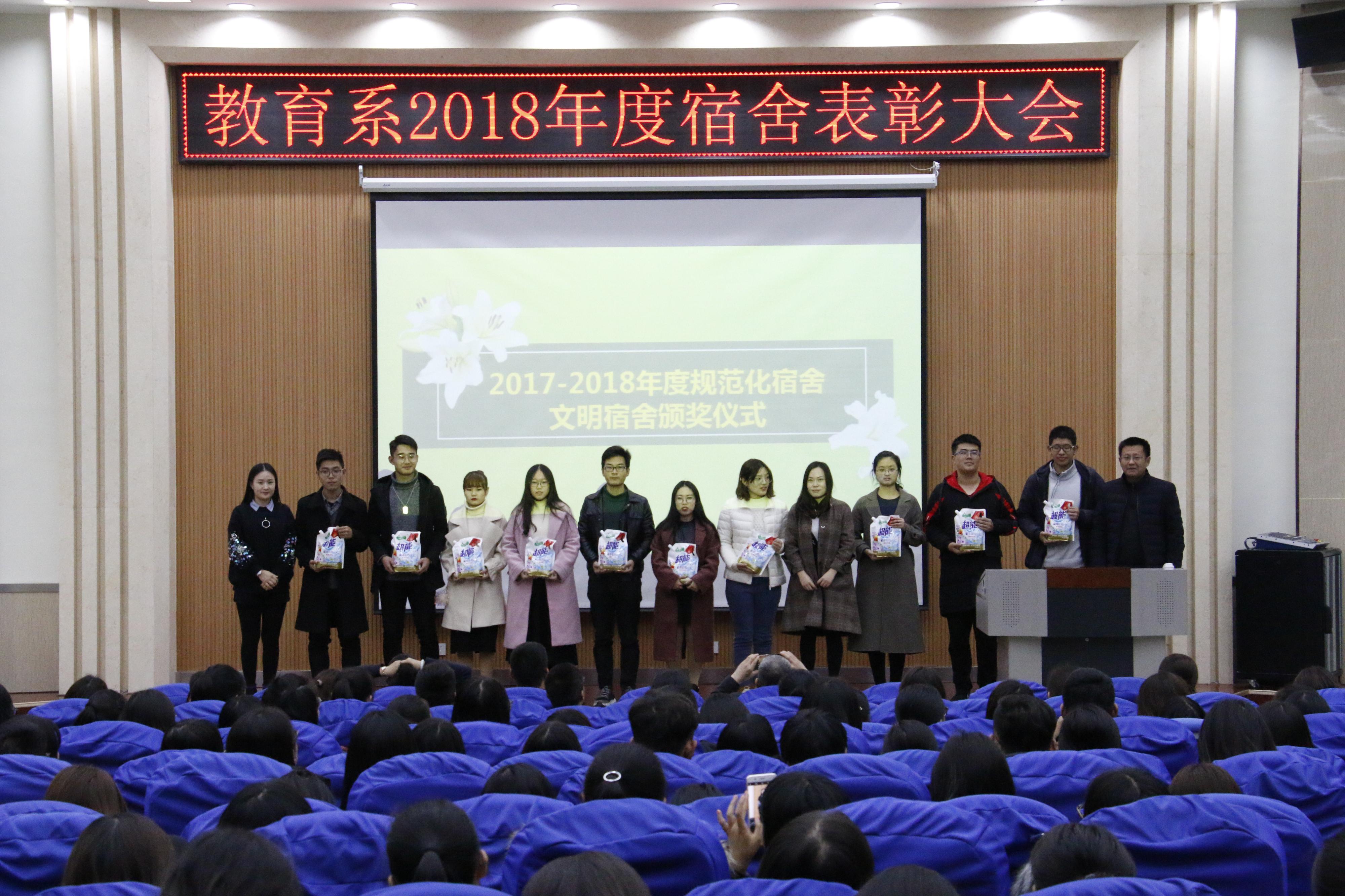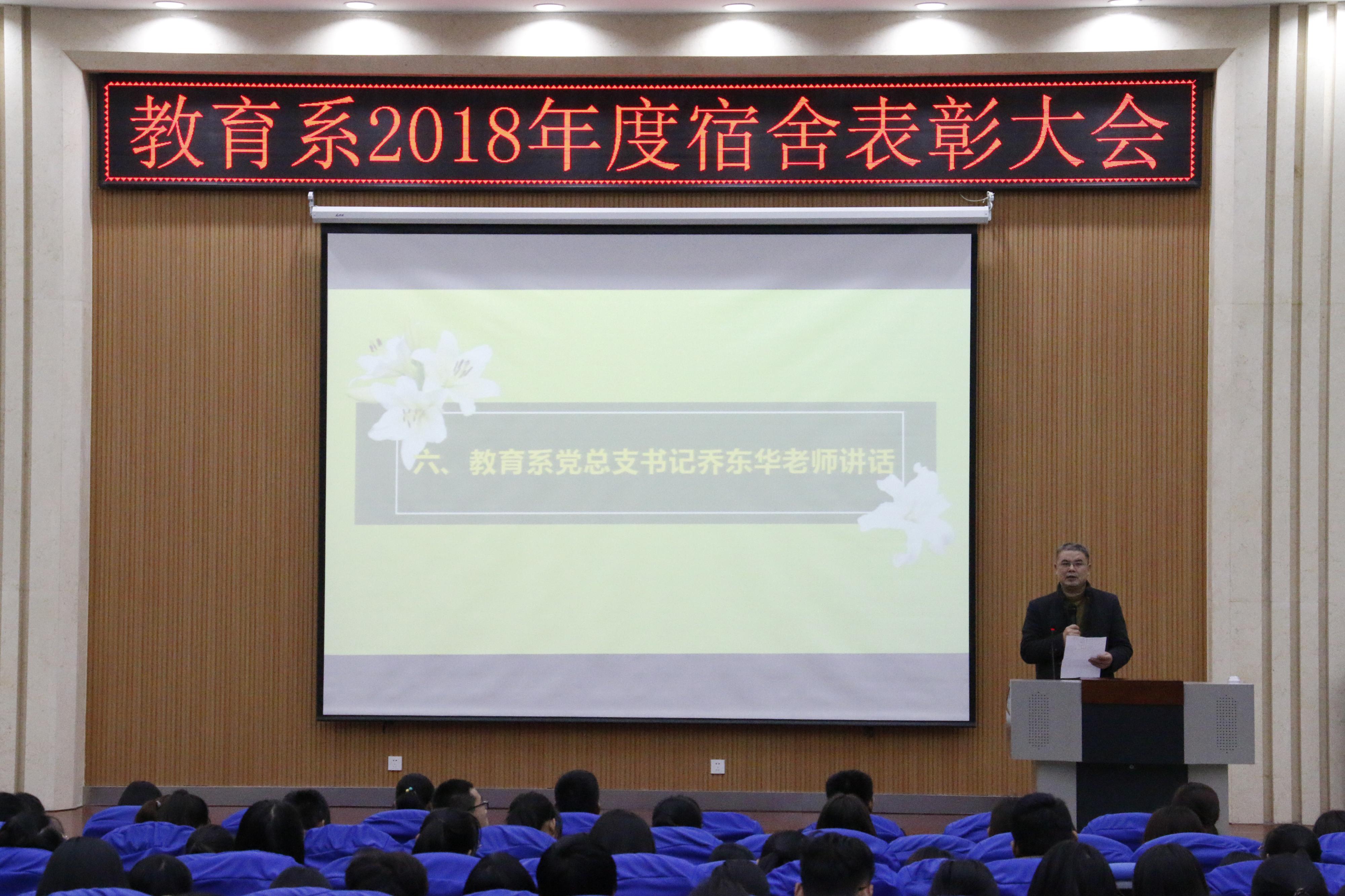 2018年11月23号16时,“教育系2018年宿舍表彰大会”在3号楼报告厅举行,教育系党总支书记乔东华、党总支副书记刘勇、团总支书记杜鹃出席。 会上,对宿舍管理工作进行了分析并对获奖宿舍进行了表扬,乔东华对创建规范化、文明化宿舍所做的工作给予肯定,分析了宿舍管理工作对大学生的重要性,并提出了“四个三,两个一”的要求,鼓励全体同学齐心协力做好宿舍工作。 这次表彰大会进一步增强了同学们的集体荣誉感和宿舍凝聚力,提高了同学们参与规范化宿舍和优秀宿舍建设的积极性。相信在教育系全体师生的努力下,宿舍管理工作必将更上一楼!