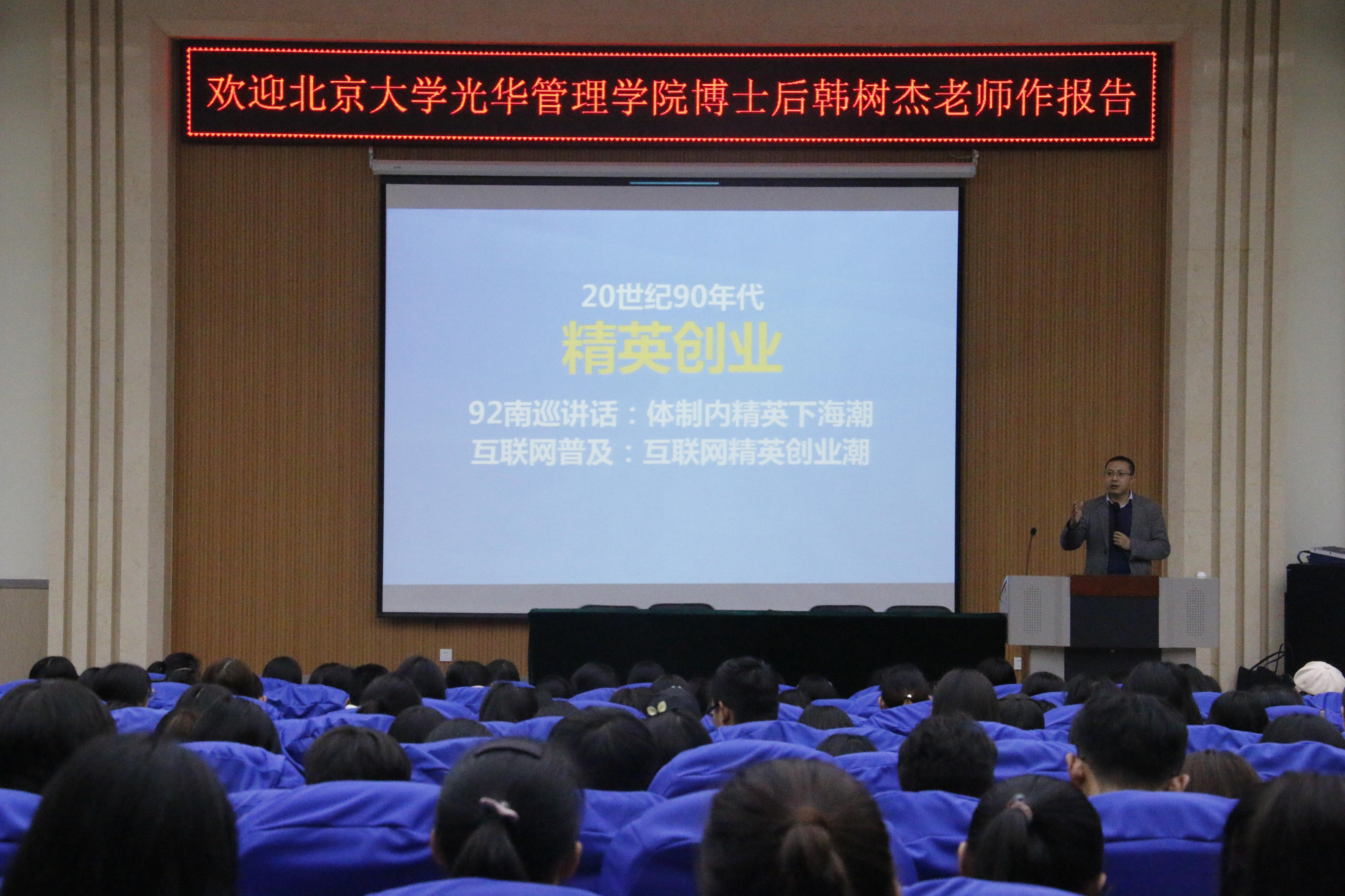 报告会上, 韩树杰博士以图片的形式向大家展示了“创业中国四十年”的成果,详细论述了不同的社会阶段涌现出不同的创业特点。随后,韩老师重点阐释了创新思维、创业技术与艺术创业模式的理念,着重强调了创新创业是一种人生态度和生活方式,并引导同学们思考创新创业的核心问题。韩老师结合自身多年实践经验以及作为中国“互联网+”大学生创新创业大赛总决赛评委的经历,就如何释放创造性潜能,由想法到现实,给大家作了精彩分享。