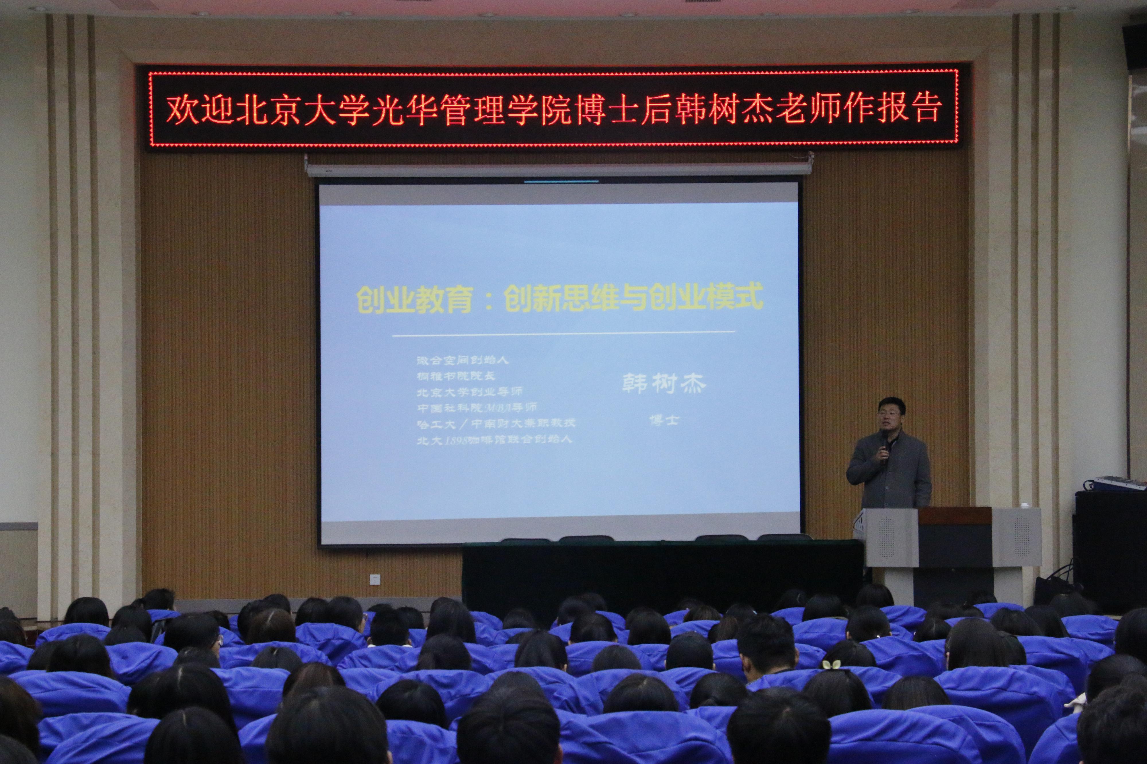 敢闯会创,“青春梦”融入“中国梦”。为更好地将创新创业教育有效融入人才培养计划,提升人才培养质量,促进学生对创新创业的了解,提高同学们的综合素养,11月8日晚,教育系邀请著名商业模式专家与创业导师韩树杰来校作题为《大学生创新思维与创业素质培养:释放创造性潜能》的学术报告。报告会由教育系党总支副书记刘勇主持。教育系500余名师生代表聆听了讲座。