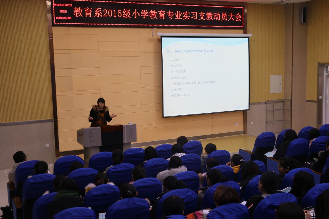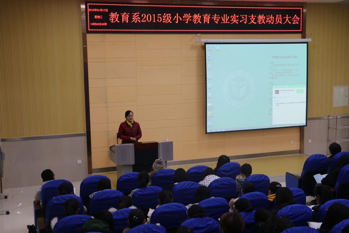 1月17日下午,教育系在文科楼B101教室召开了2018年春季实习支教动员大会。系主任李群、副主任张邦伟、办公室主任孔凡华、辅导员徐艳艳及参加实习支教的2015级小学教育专业的97名同学参加了动员会。动员会由徐艳艳主持。