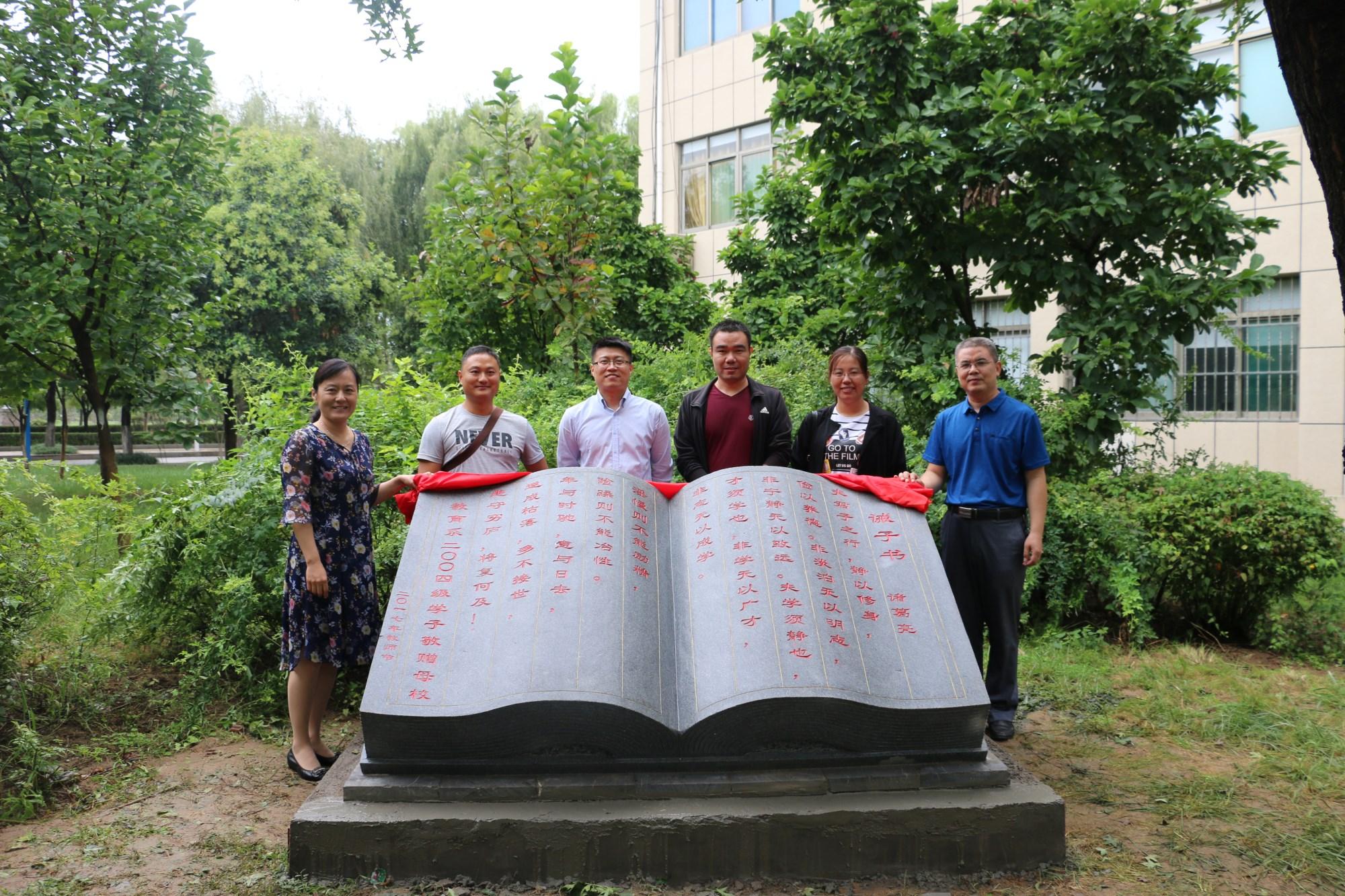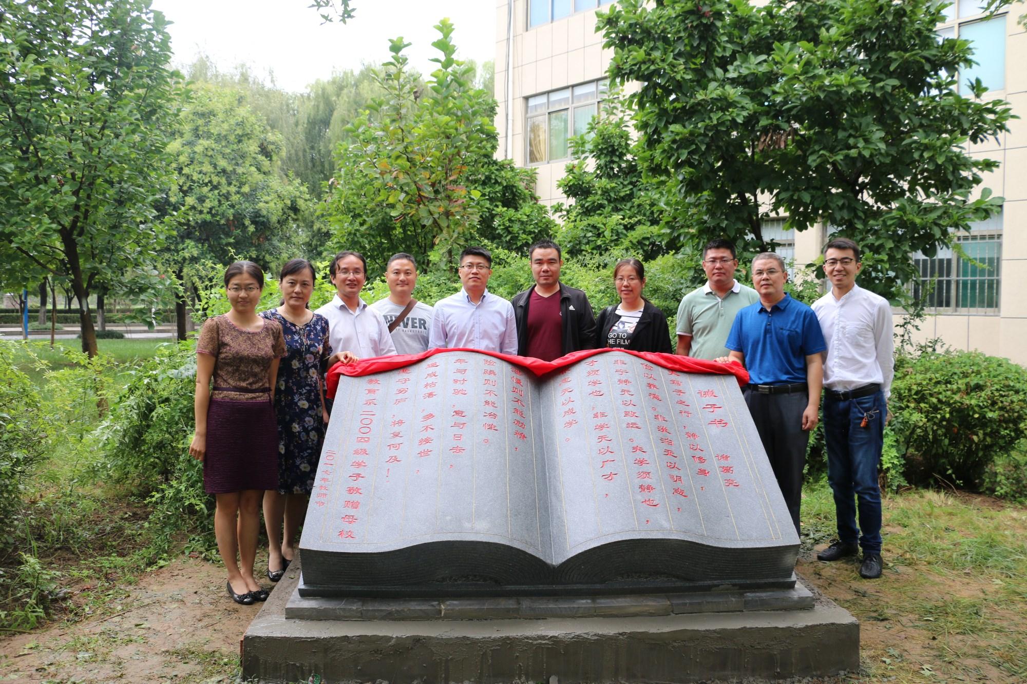 9月10日上午,值此第33个教师节之际,我系2004级校友刘文涛、韩明帅、孔芳、陈卫士一行4人回到母校,代表2004级全体学子,向教育系赠送了石刻 《诫子书》雕塑一座,以此表达对母校老师的感恩之情并送上节日的祝福。系党总支书记乔东华和李群主任代表教育系全体老师向2004级校友表示热烈的欢迎和诚挚的谢意,并希望校友们不忘初心,继续前进,在各自的工作岗位上不断取得更大的成就,时刻关心母校的发展,欢迎大家常回家看看。校友们表示:在以后的日子里会不断努力做出成绩,回报社会。不管走到地球上任何一个角落,济宁学院教育系永远是自己心中最温暖的家。系副主任张邦伟、党总支副书记刘勇、团总支书记单清清也一同参加了此次活动并送上诚挚的祝福。