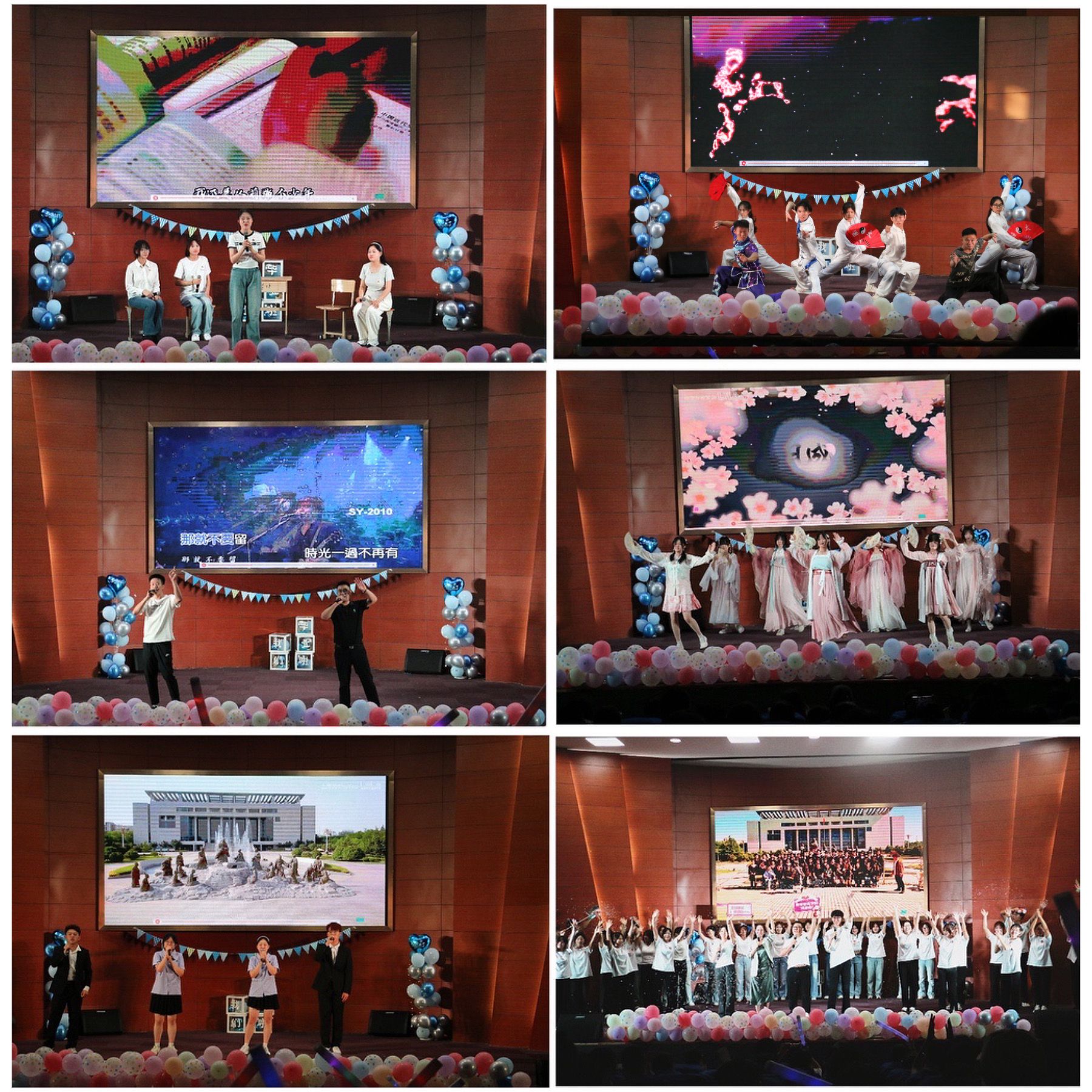 晚会分为“繁星闪烁,梦想启航”、“青春华章,时光留痕”、“未来可期,不说再见”三个篇章,融合舞蹈、歌曲、朗诵、小品等多种艺术形式。活力四射的啦啦操舞蹈拉开晚会序幕。精彩绝伦的武术表演《龙腾虎跃》带动了整场的气氛,一招一式尽显中华传统武术魅力;幽默诙谐的小品《消失的周日》引来阵阵欢笑;《歌曲串烧》《突然的自我》《大学问》接连登场,唱出多少少年事,唱出多少不舍情;如山涧泉鸣,似环佩铃响,古筝演奏曲《大鱼》的柔情与灵动,仿佛是对毕业生们青春岁月的温柔告别;幕布剧《时光背后的我们》、情景剧《我们的选择》带我们重温了那些难忘的校园时光,感受青春的活力与美好;舞蹈《花月成双》如梦如幻,展现出别样的视觉盛宴。演出过程中还增添了抽奖互动环节,现场欢声笑语、高潮不断。