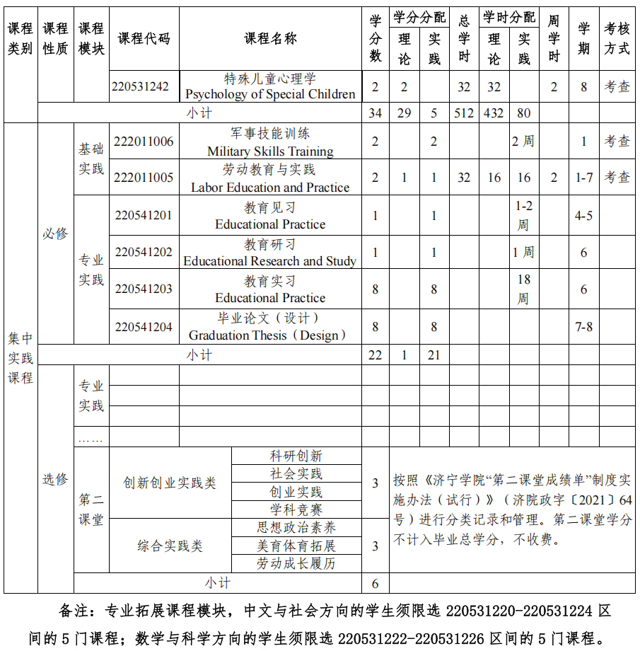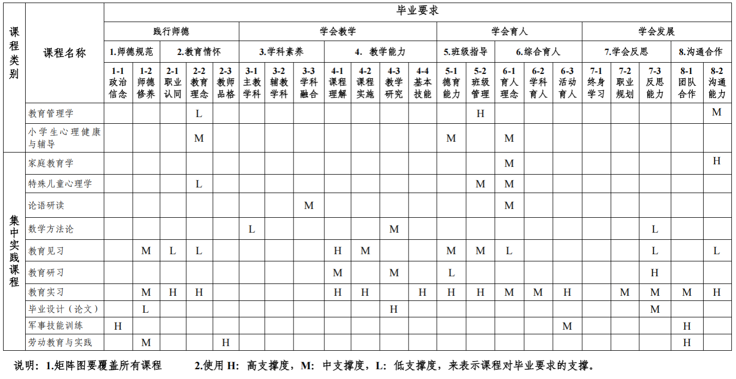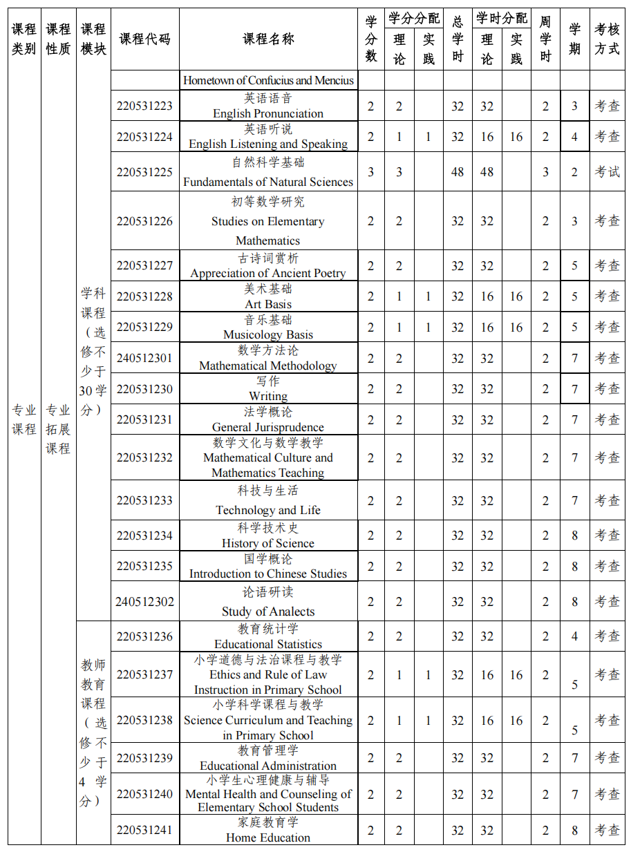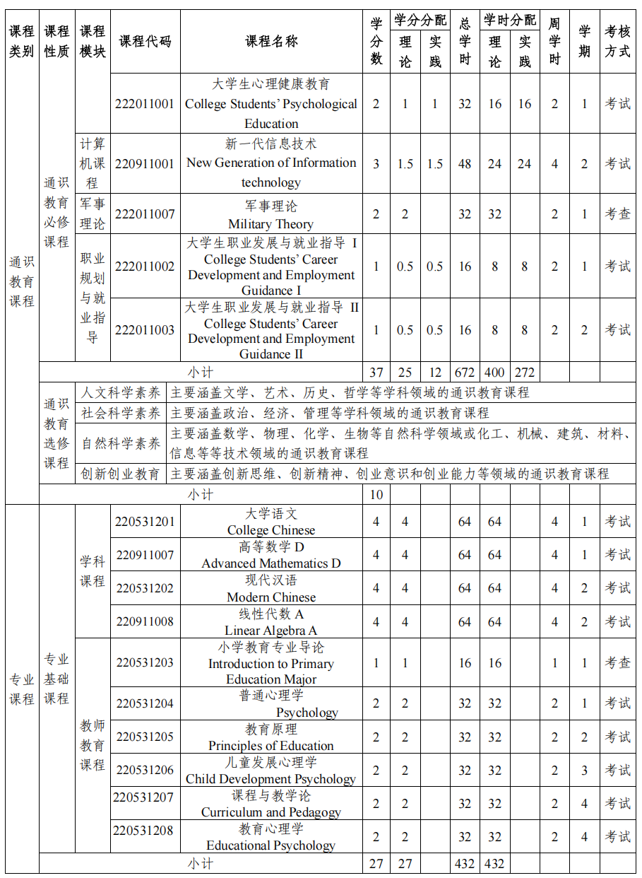 专业基础课程:大学语文、高等数学、现代汉语、线性代数、小学教育专业导论、普通心理学、教育原理、儿童发展心理学、课程与教学论、教育心理学。