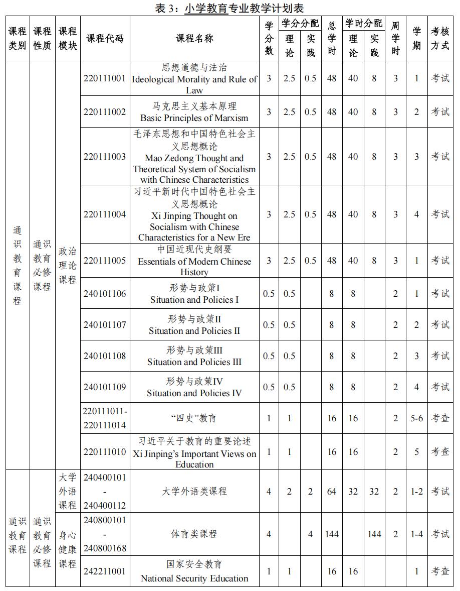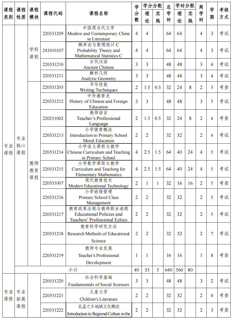 专业核心课程:中国现当代文学、概率论与数理统计、古代汉语、解析几何、中外教育史、小学德育概论、小学班级管理、教育政策法规与教师职业道德、教育科学研究方法、教师专业发展、小学语文课程与教学、小学数学课程与教学、书写技能、教师语言、现代教育技术。