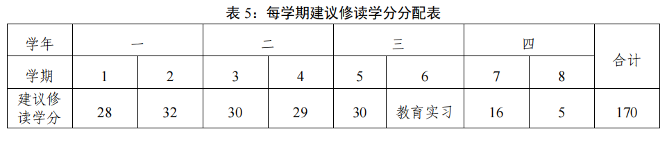 本专业标准学制四年,学校实行学分制管理下的弹性学制,允许学生在3~8 年内修完规定课程,修满170 学分准予毕业。符合学位授予条件者,经学校学位委员会审核通过,可授予教育学学士学位。