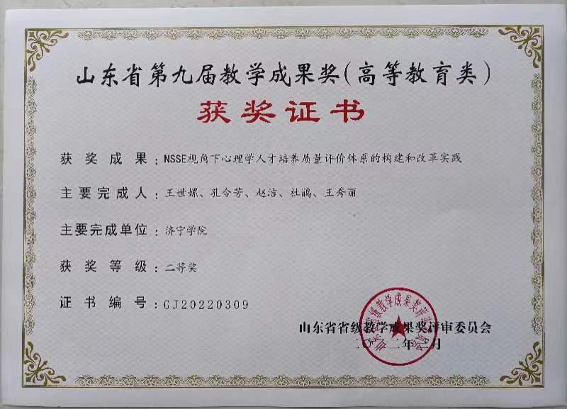 根据《山东省教育厅关于开展第九届省级教学成果奖(高等教育类)评选工作的通知》(鲁教高函〔2021〕32号)有关部署,经个人申报、学校推荐和专家评审、评委会审议等环节,我院王世嫘老师的成果《NSSE视角下心理学人才培养质量评价体系的构建和改革实践》获得山东省第九届教学成果奖(高等教育类)二等奖。