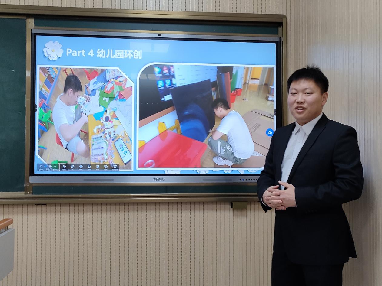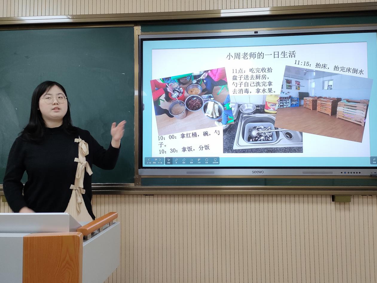 七位参评同学从实习幼儿园班级环境创设、游戏与活动组织、幼儿生活常规、幼儿交流互动等方面进行汇报。每位同学都阐述了自己丰富多彩的教育实习经历,并进行了经验总结。