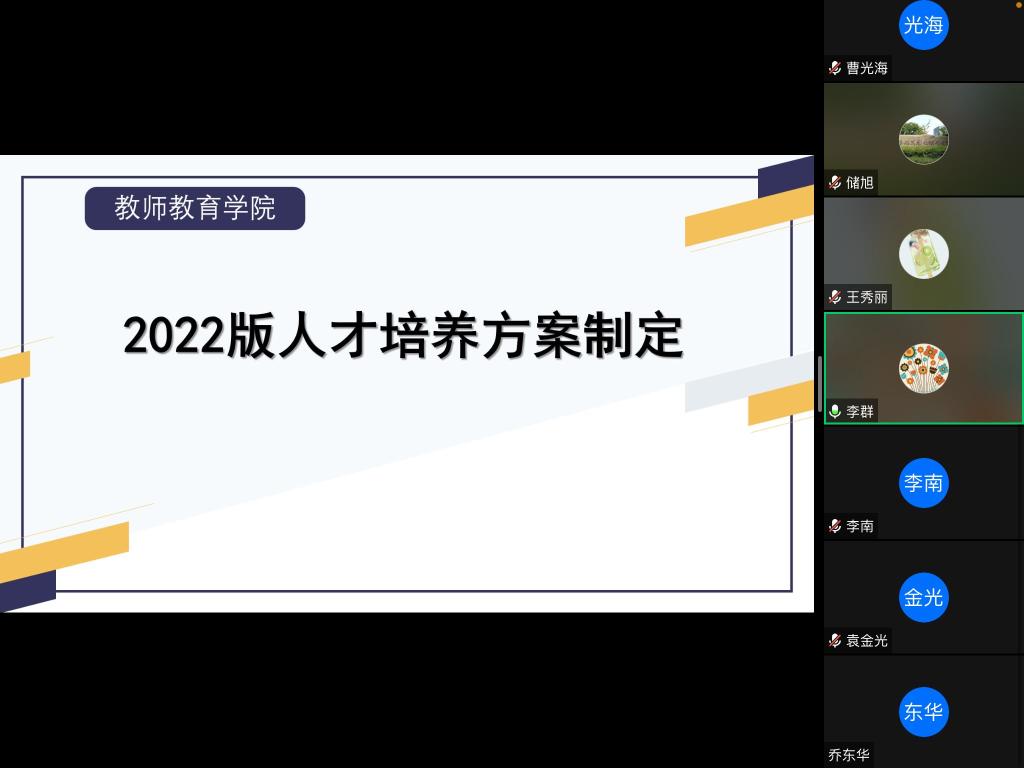 会议围绕2022版人才培养方案制定、专业建设项目预算方案编制、专业师资队伍建设、校地(企)合作育人、招生就业宣传等议题进行研讨。单清清传达了学校2022版人才培养方案制定的工作要求,并对教师教育学院方案制定工作进程安排进行了详细说明。曹光海对学院的招生宣传与就业工作,特别是专升本招生政策做了具体介绍。李群就加强专业建设提出了指导意见:一是严格执行《普通高等学校本科专业类教学质量国家标准》和国家师范专业认证标准,按照学校要求和专业特点,高质量完成2022版人才培养方案的制定工作。二是积极争取心理学省级一流专业和小学教育校级重点专业建设经费,做好专业建设项目预算和建设方案的编制与论证工作。三是群策群力,充分发挥各教研室的作用,做好高层次人才引进和校地(企)合作育人等工作。与会教师围绕上述议题展开了热烈的讨论,李群逐一解答了各教研室主任的疑问,并对大家的敬业精神和工作热情给予了肯定与赞赏。