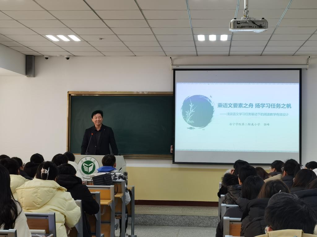 12月21日,教师教育学院邀请济宁学院第二附属小学副校长、齐鲁名师郭峰来校开展“名师进课堂”教学活动,教师教育学院副院长贾英侠、语文学科教法教师、2021级小学教育专业全体学生参加活动。