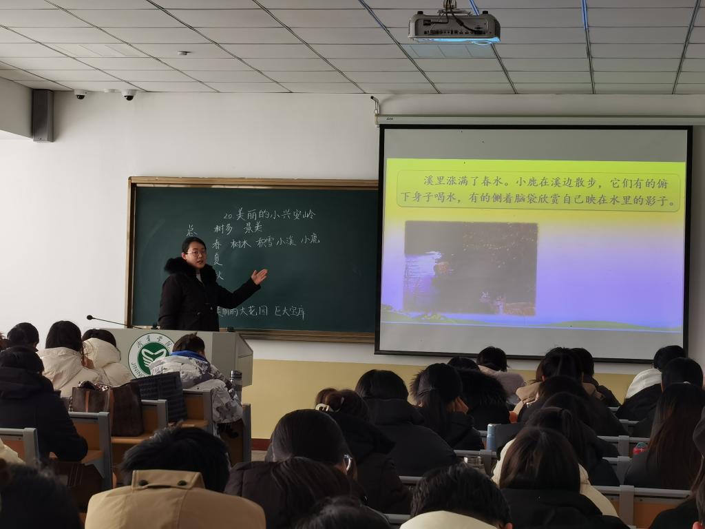 小学教育专业孙晗菲和刘文柯同学先后对小学语文教学内容《美丽的小兴安岭》和《太阳》两篇课文进行了模拟教学,郭峰与教法课教师带领学生一起进行了课堂教学观察,并展开交流讨论。随后郭峰老师对两位同学的教学展示进行了深入细致地点评,他认为两位同学的教学目标明确,教学环节完整,教学重点突出,较好地体现了语文新课程标准理念,同时他也指出学生在教学内容的组织加工、学习任务的落实等方面存在不足。