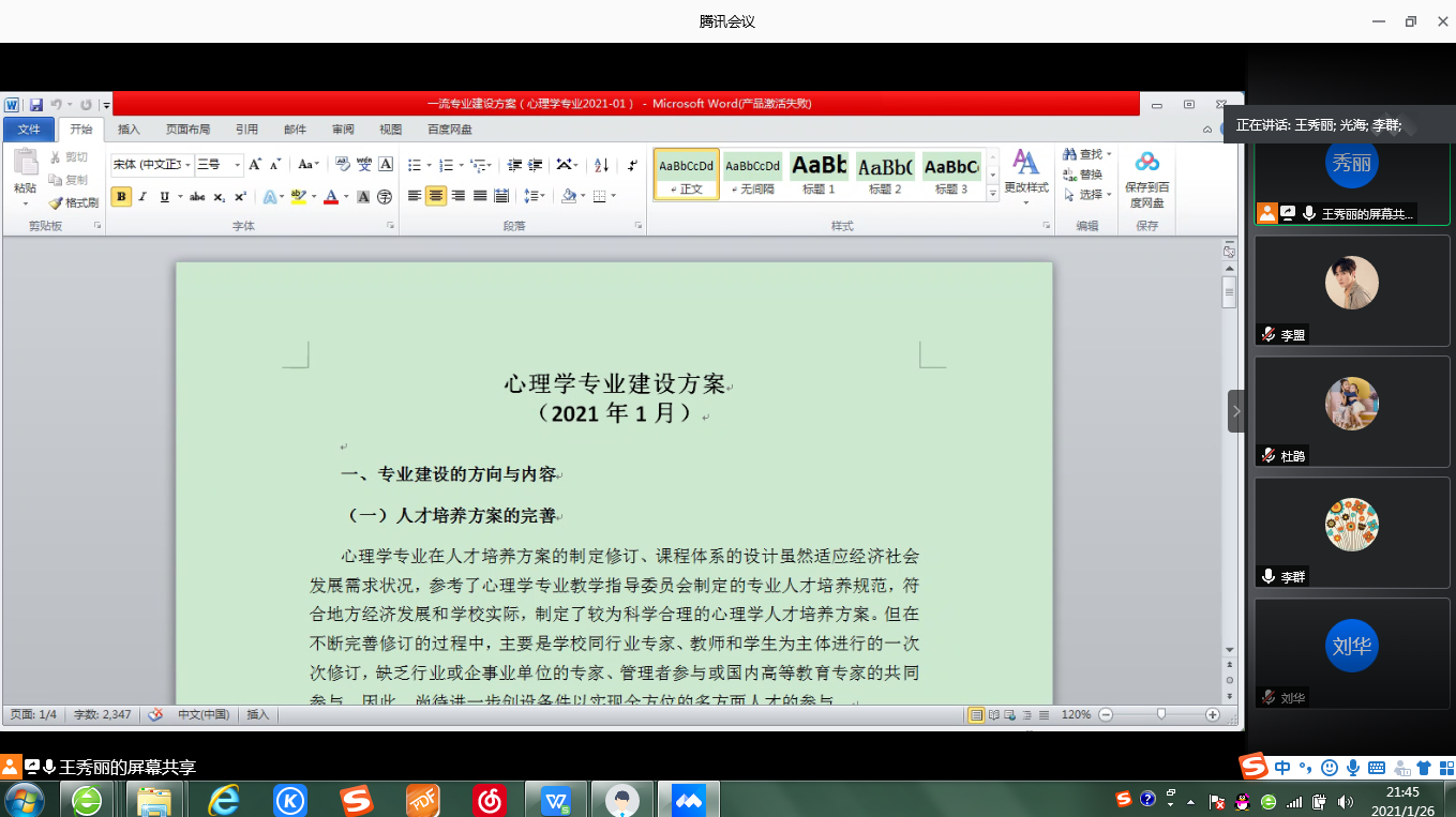 为加快心理学一流本科专业建设,进一步提高心理学人才培养质量,教育系1月26日晚上组织召开了省级一流本科专业建设推进与研讨线上会议。教育系主任李群、教务处副处长张邦伟、教育系(教师教育学院)相关负责人及心理学教研室教师参加了会议,心理学专业负责人王秀丽主持了会议。