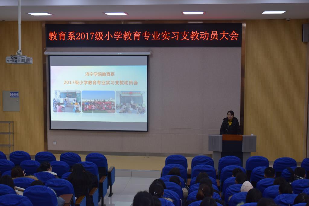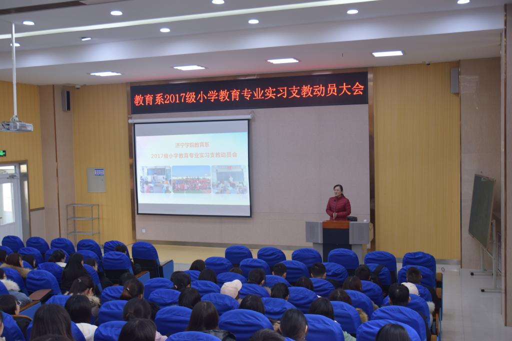 12月30日下午,教育系在9号楼D101召开2017级小学教育专业实习支教动员会,教育系主任李群、副主任贾英侠、团总支书记杜鹃及2017级小学教育专业91名学生参加会议。