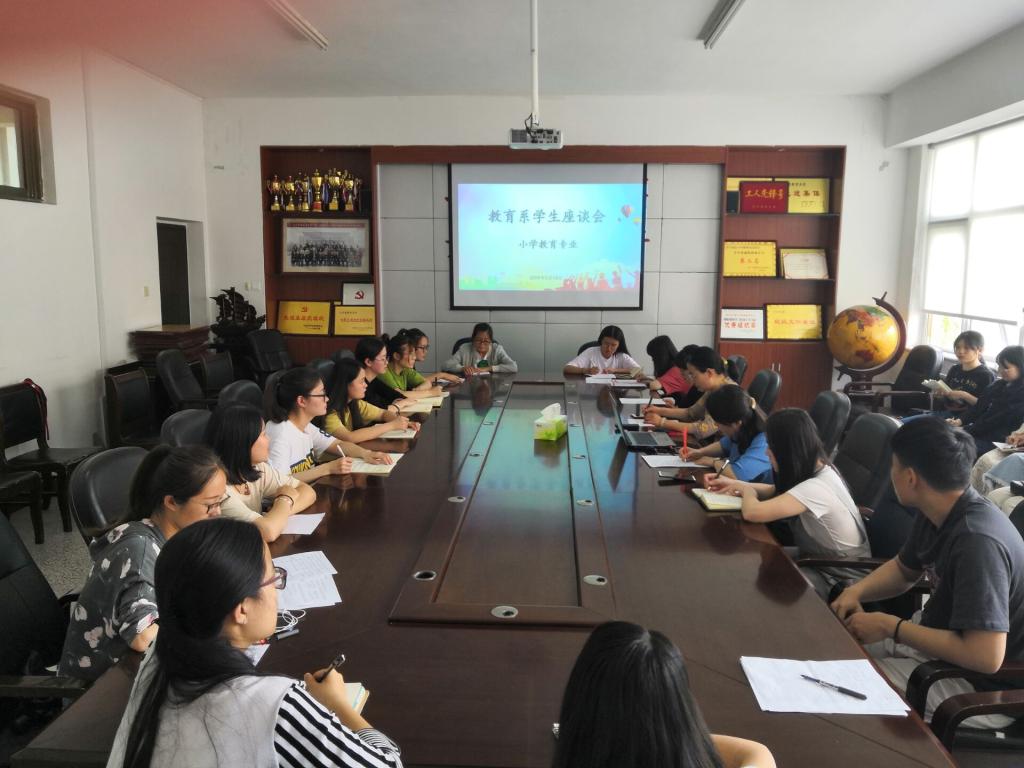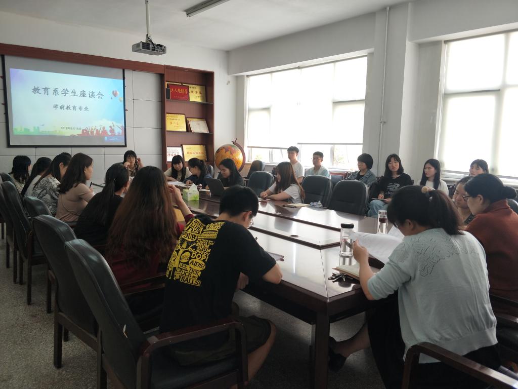 2019年5月13日至5月20日,教育系组织召开了2018-2019-2学期期中教学检查学生座谈会。此次座谈会根据专业分成三个小组进行,分别由单清清、曹光海、贾英侠主持,各教研室主任、辅导员等出席座谈会,每班2名学生代表参加了座谈。