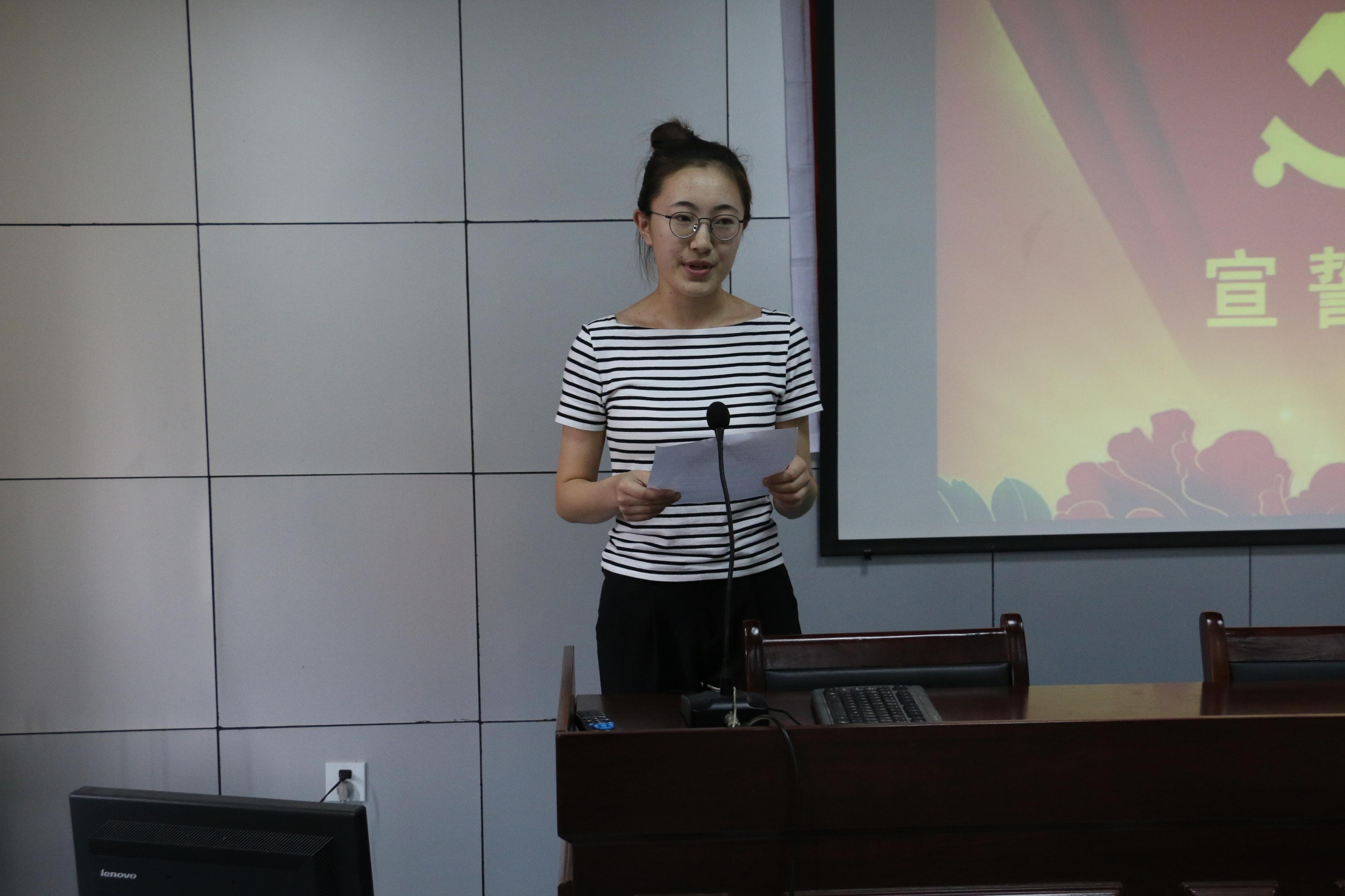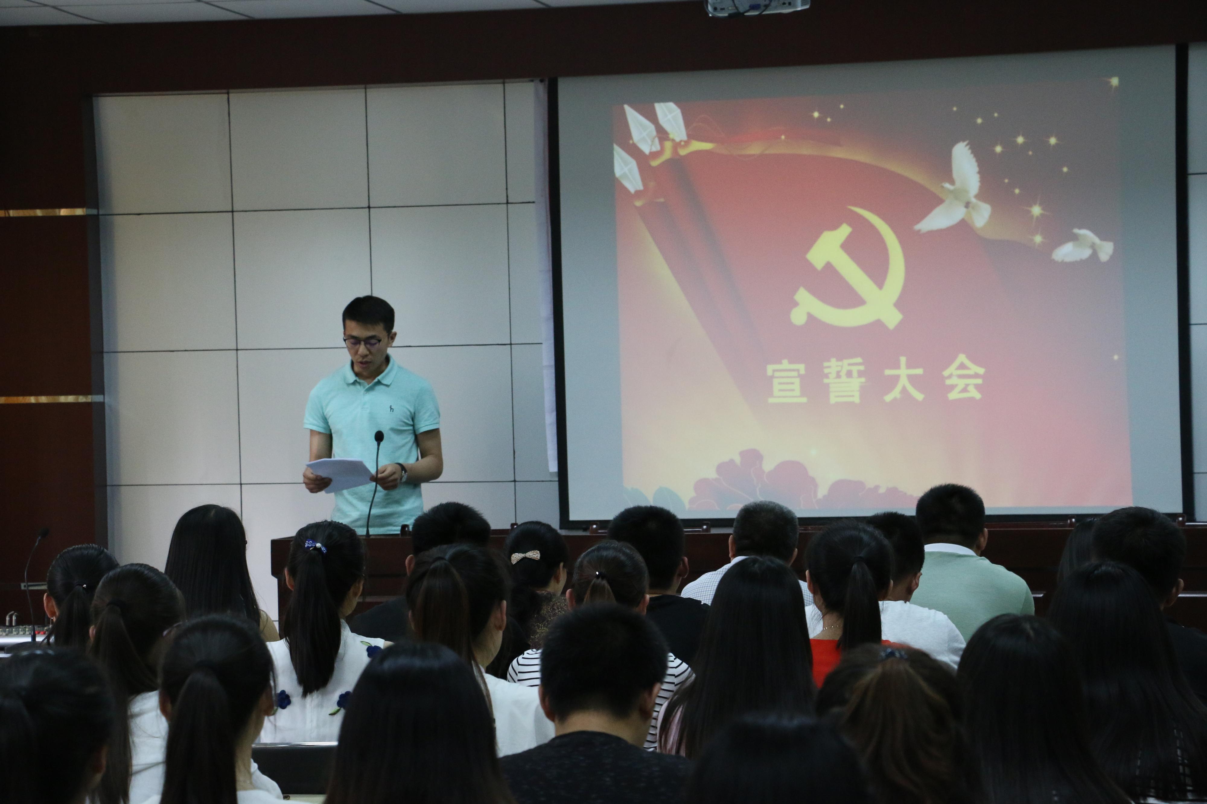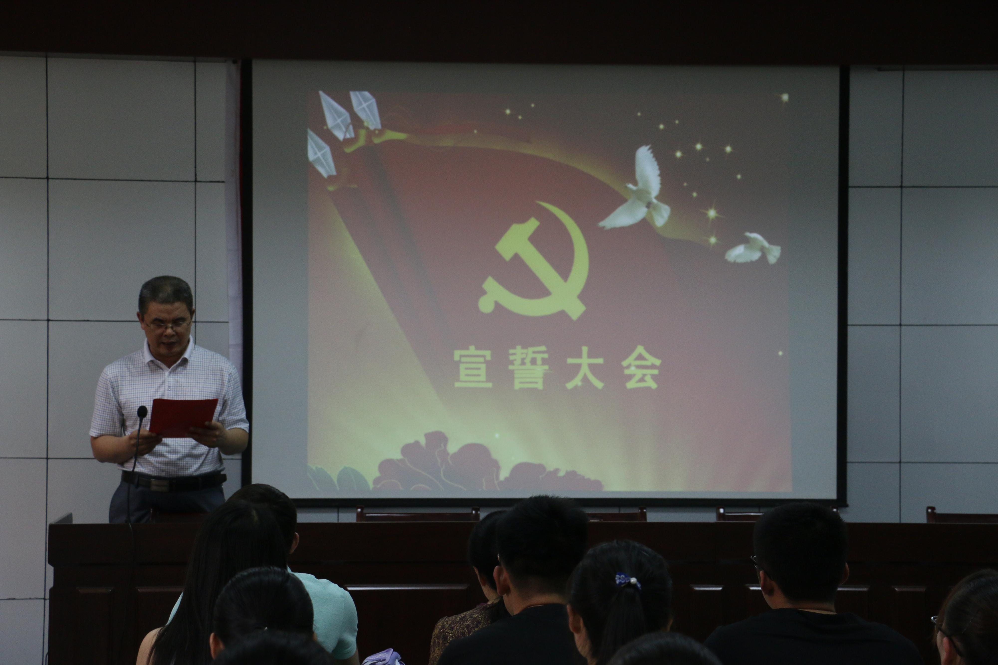 大会在雄壮的《国际歌》中拉开了帷幕。学生党支部书记单清清宣读了预备党员名单,学生支部委员徐艳艳带领37名预备党员面对党旗庄严宣誓。老党员代表齐文强老师、预备党员代表刘俊凤以及入党积极分子代表颜博先后发言。党总支书记乔东华向参加宣誓大会的37位新党员表示衷心的祝贺并提出四点希望和要求:一是要坚定理想信念,永葆政治本色。二是恪守入党誓言, 践行庄严承诺。三是勤奋学习,努力成才报国。四要创先争优,争当模范。