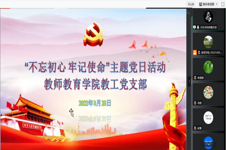 为喜迎党的二十大召开,落实学校党委工作要求,9月28日下午,教师教育学院教工党支部以线上线下相结合的方式开展“不忘初心、牢记使命”主题教育。会议由教工党支部书记赵国丽主持,全体教工党员参加。