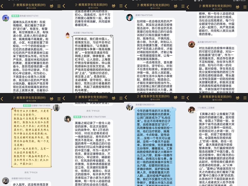 20204月2日晚,教育系学生党支部利用QQ群课堂开展了以“居家学习、同心抗‘疫’”为主题的线上主题党日活动,活动由支部书记杜鹃老师主持,学生党支部全体党员参加。