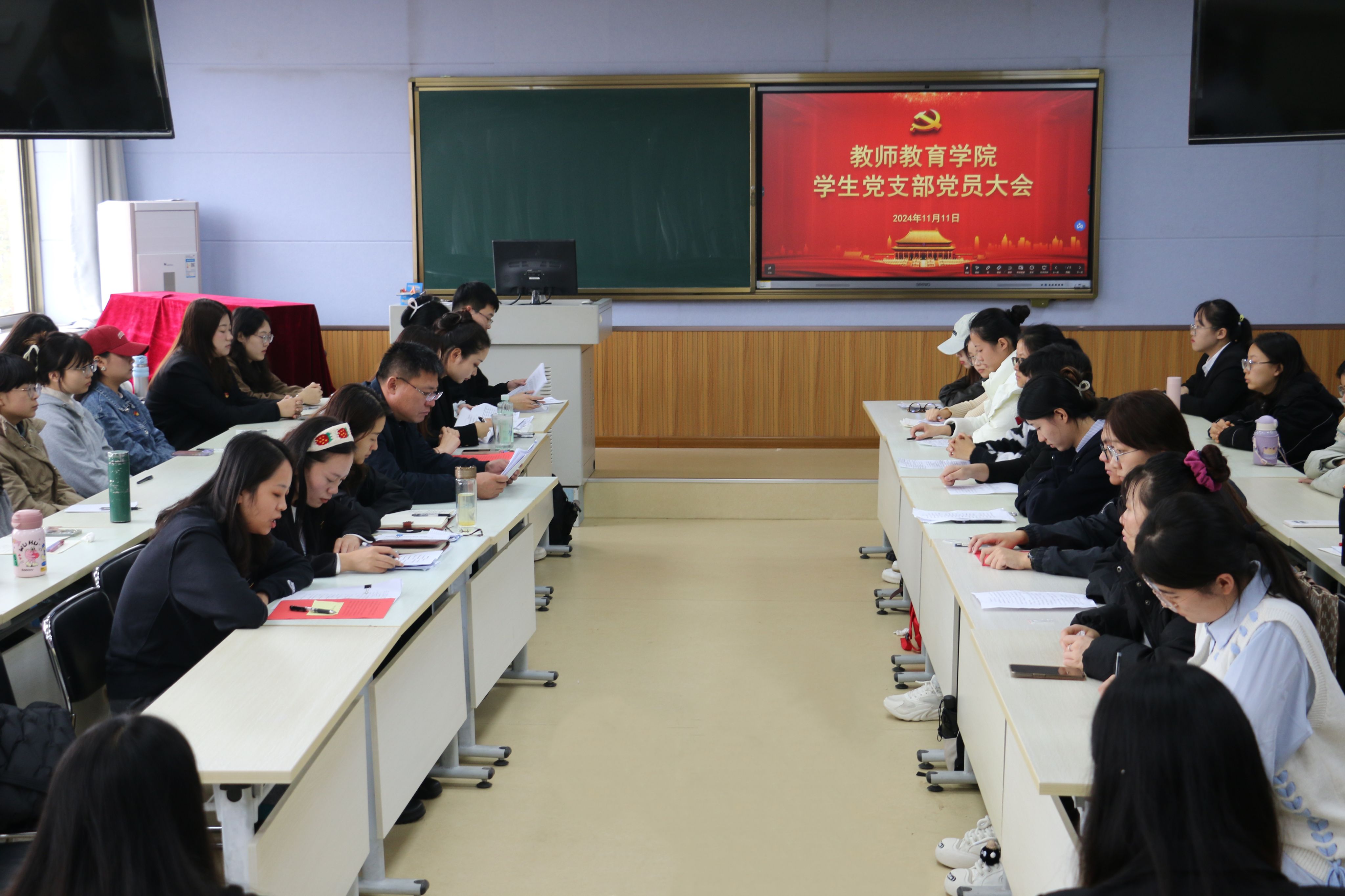 11月11日,教师教育学院学生第一、第二党支部分别于2号楼C409、C410召开预备党员接收大会,学院党委书记刘勇、党委副书记杜鹃列席会议。会议由各党支部书记主持。