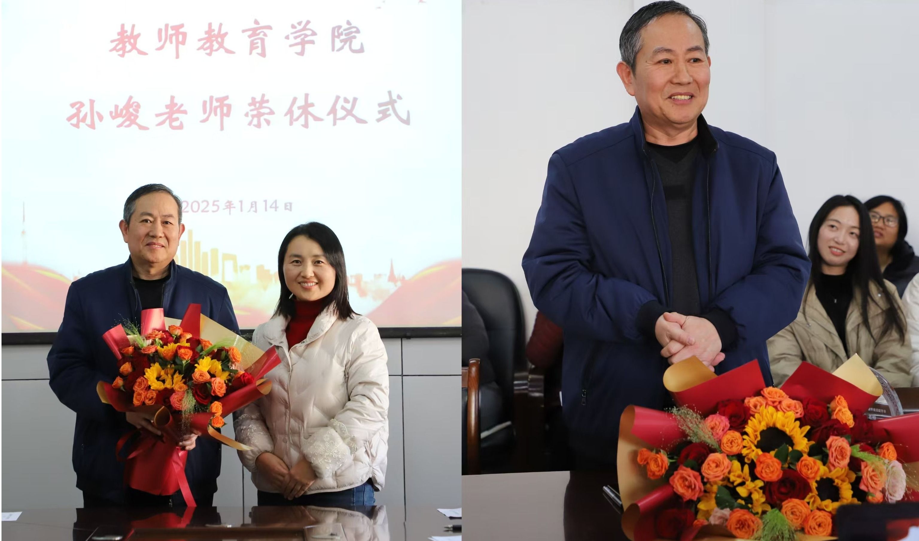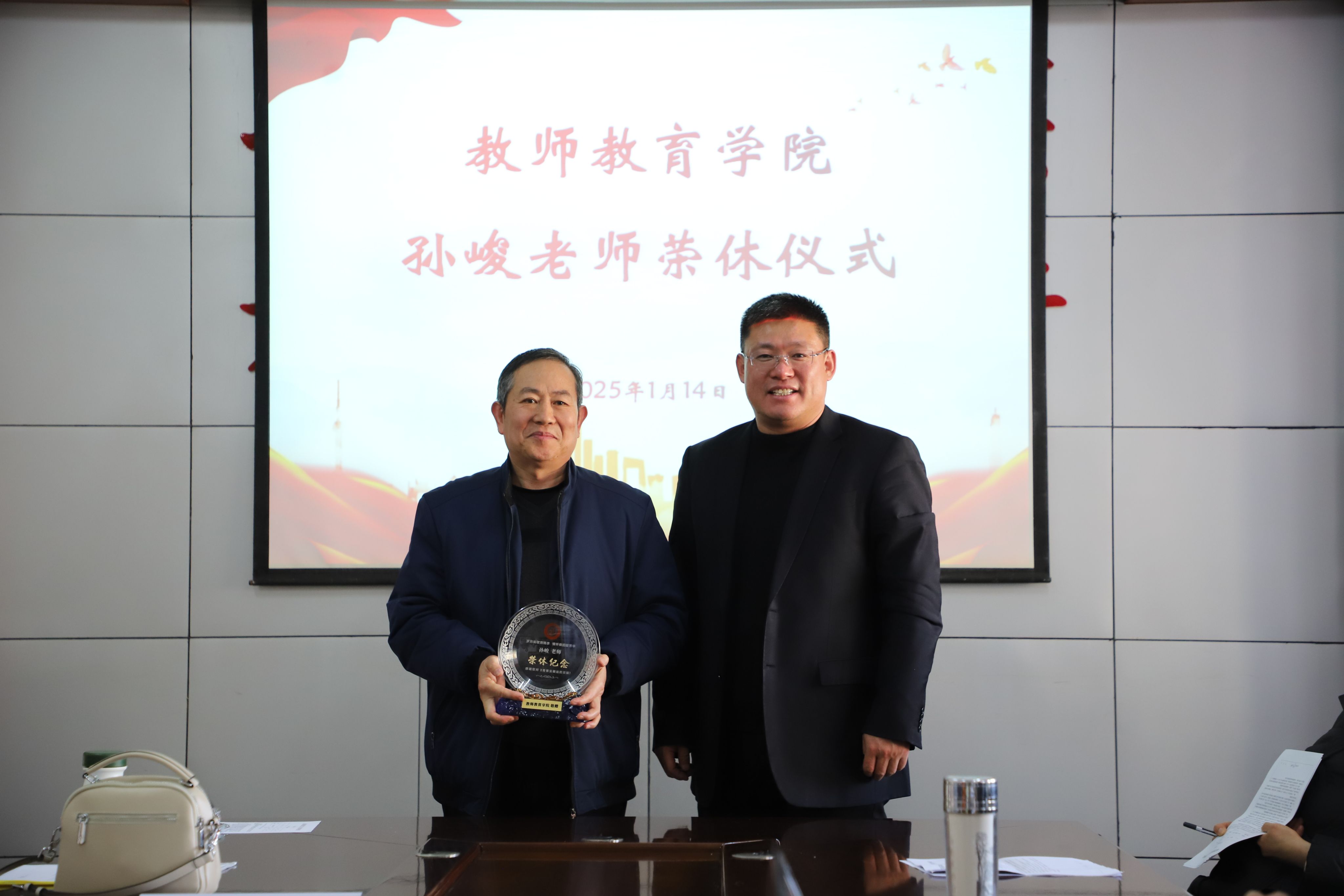 1月14日下午,教师教育学院教师荣休仪式在2号楼A211隆重举行。该院党委书记刘勇、院长曹光海、副书记杜鹃、副院长贾英侠出席,荣休教师孙峻副教授及全体教职工参会。仪式由杜鹃主持。