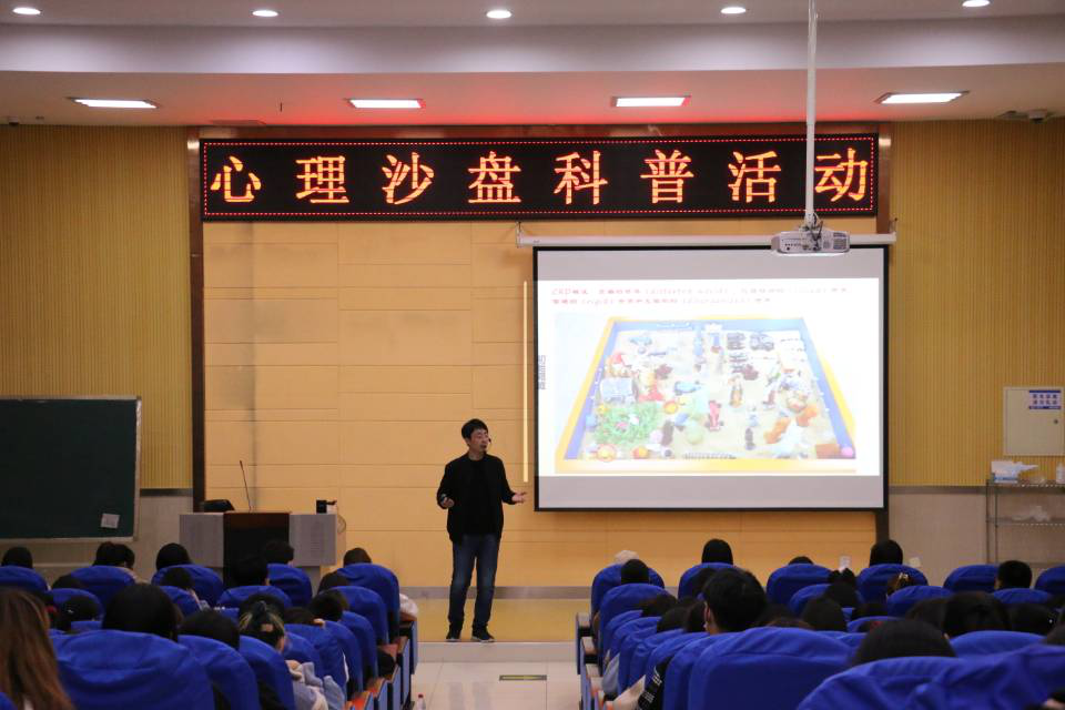 沙盘游戏又称箱庭疗法,是在治疗者的陪伴下,来访者从玩具架上自由挑选玩具,在盛有细沙的特制箱子里进行自我表现的一种心理疗法。张利以“一期一会”为主题,用他柔和、亲切的言语讲述了沙盘游戏的起源、背景及应用,并详细的讲述了沙盘游戏的基本条件及设置、种类、实施过程及沙盘游戏在心理治疗中的优势。最后,张利用一个小故事结束了本次讲座,抽取了现场的一位幸运同学体验一次箱庭疗法。