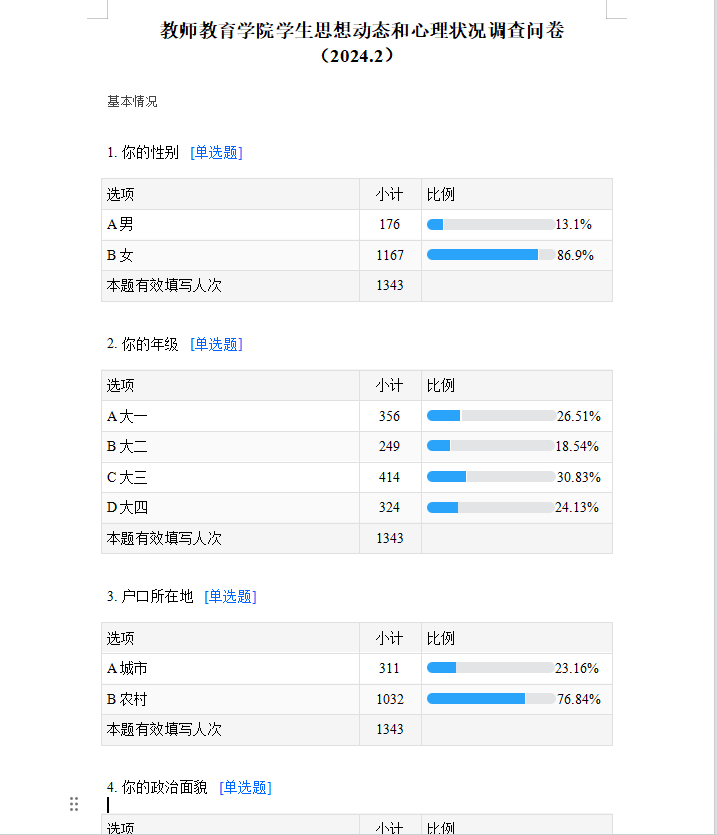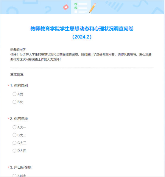 为充分了解学生寒假期间及返校后思想状况,进一步提高学生思想政治教育工作的针对性,做好学生思想引领和教育教学管理服务各项工作,教师教育学院通过问卷星对全体学生开展2023-2024学年第二学期思想动态调研。