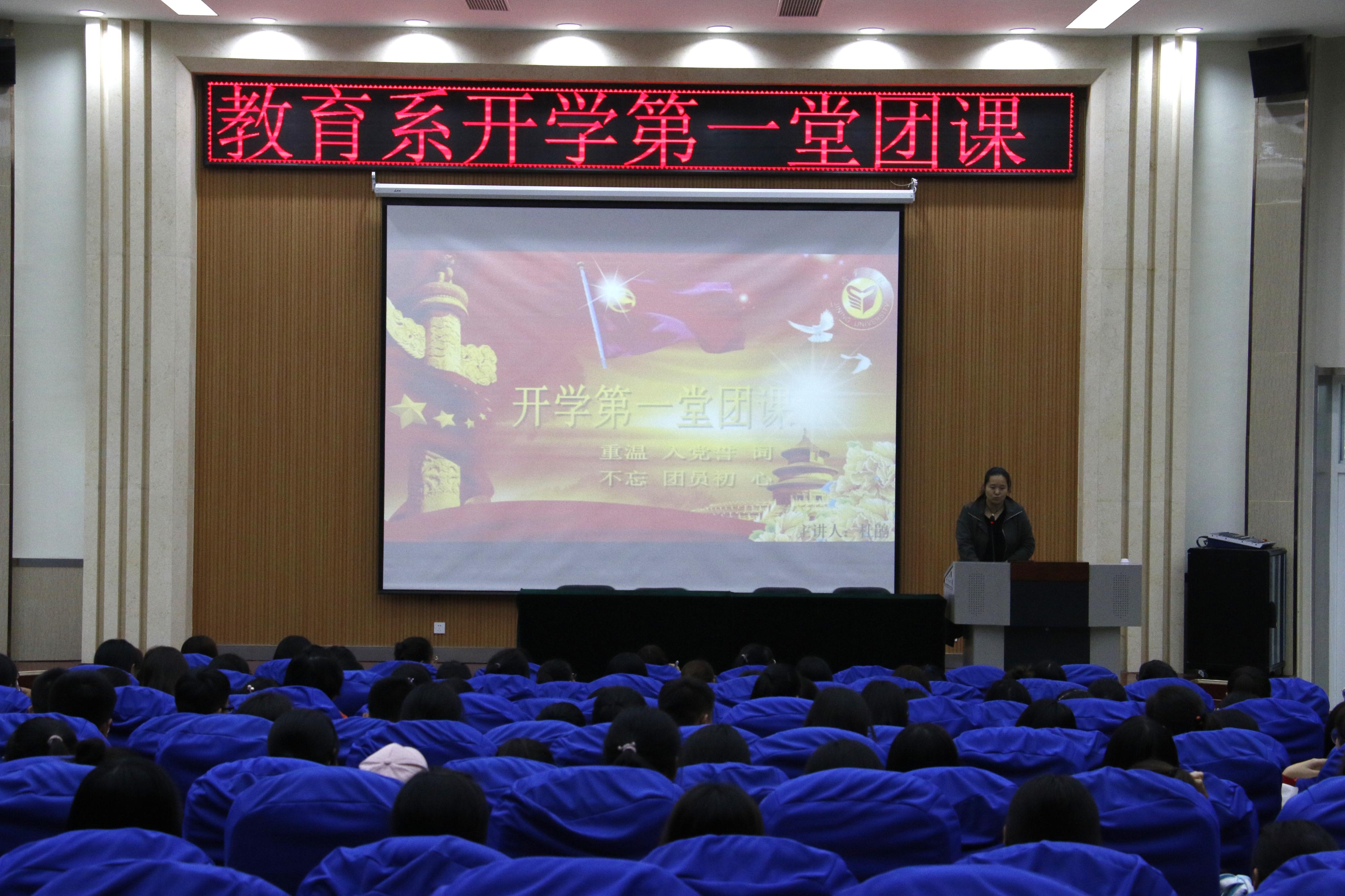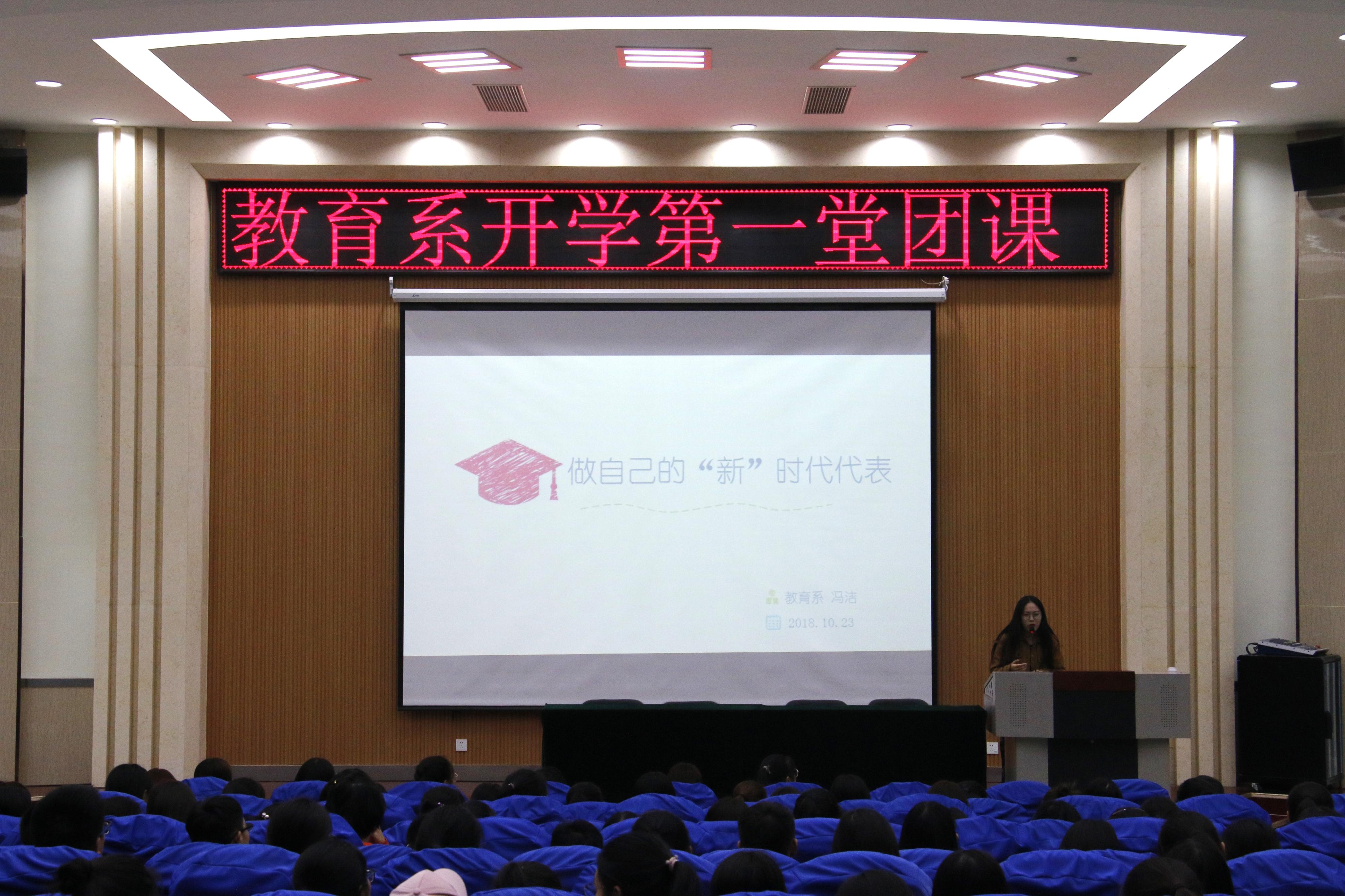 2018年10月23日下午4时30分,教育系在3号楼报告厅成功举办了“开学第一堂团课”主题会议。教育系团总支书记杜鹃老师担任本次会议主讲,2018级全体同学参加了本次会议。