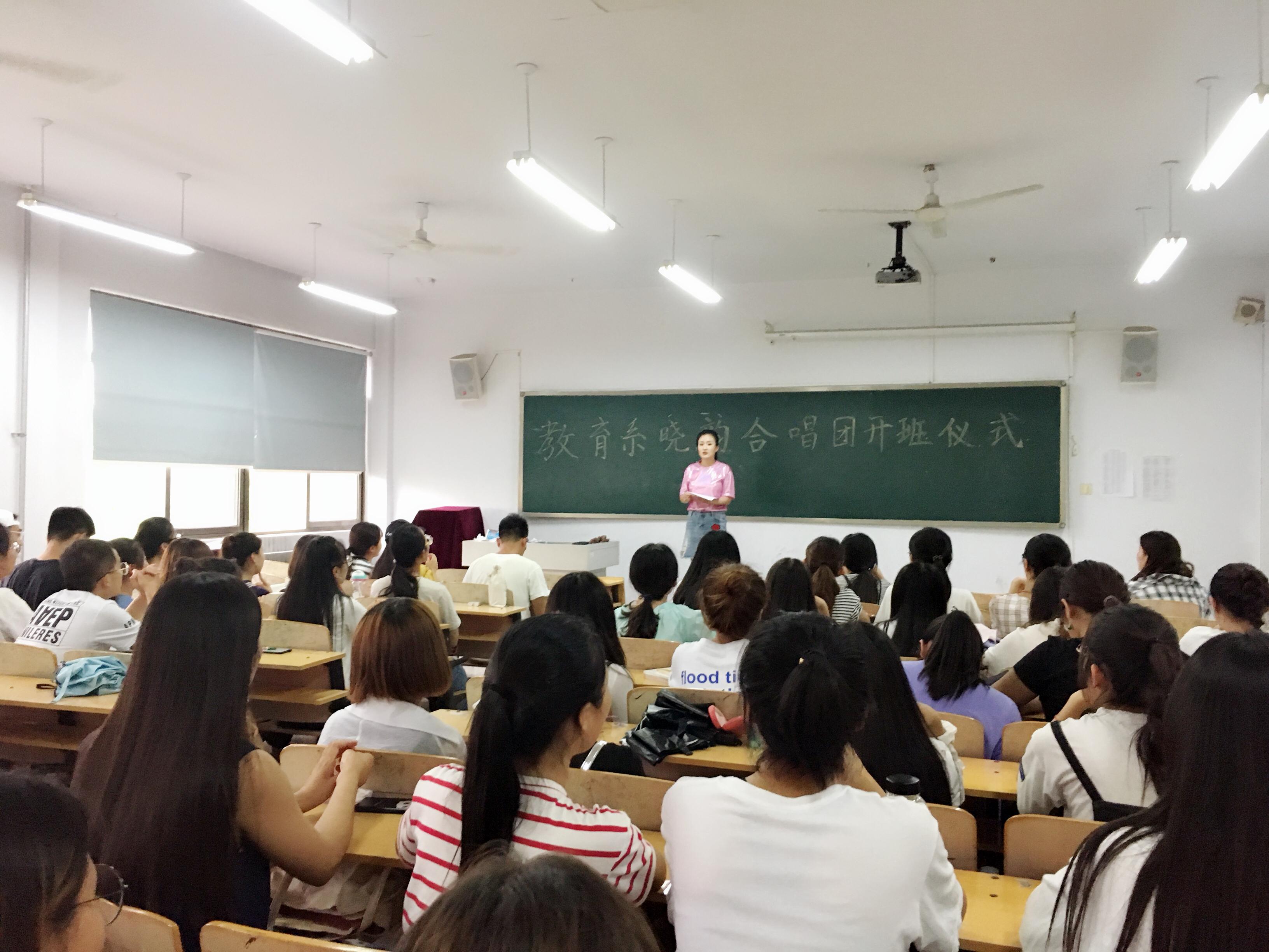 2018年6月11日下午4时30分,教育系晓韵合唱团开班仪式在c408顺利进行。教育系团总支书记杜鹃老师,教育系辅导员徐艳艳老师、田翠老师出席了本次开班仪式,合唱团全体成员参加了本次开班仪式。