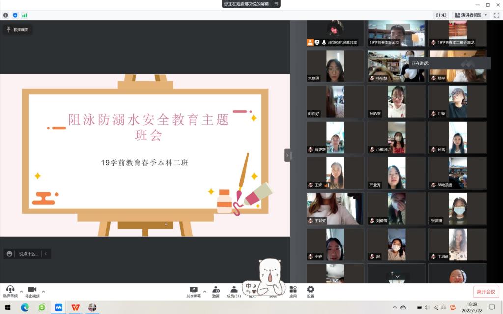 为强化学生防溺水安全意识,提高学生自防自救能力, 4月22日下午,教师教育学院组织开展了线上防溺水主题班会。