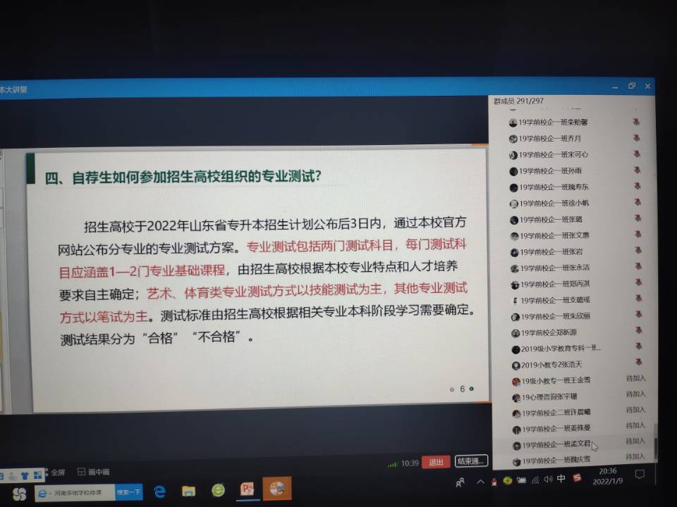 为使同学们更好地了解2022年专升本政策,做好学生服务工作,教师教育学院于2022年1月9日晚上开展了2022年专升本招生政策线上宣讲会,我院副院长曹光海及2019级专科全体学生参加。宣讲会由辅导员赵国丽主持 。