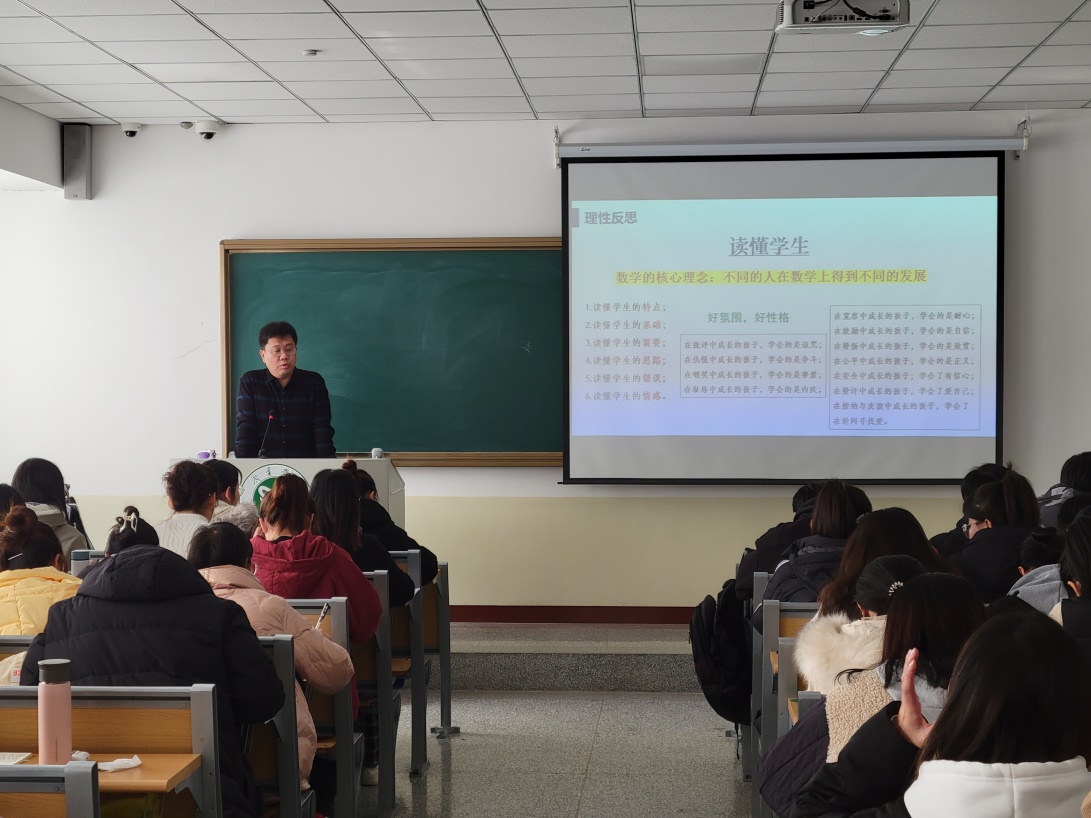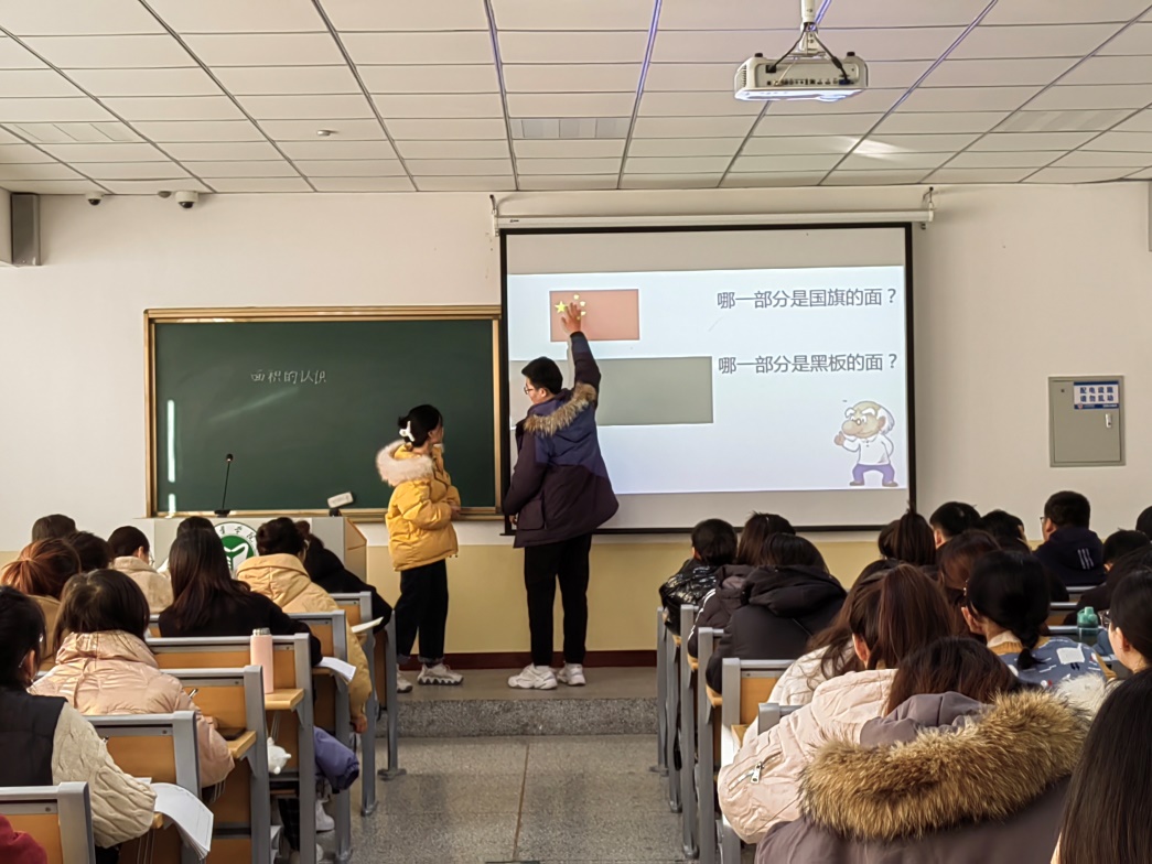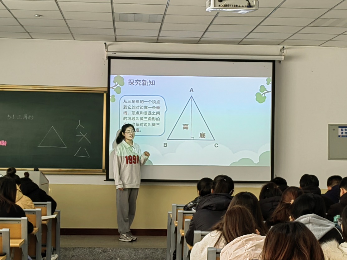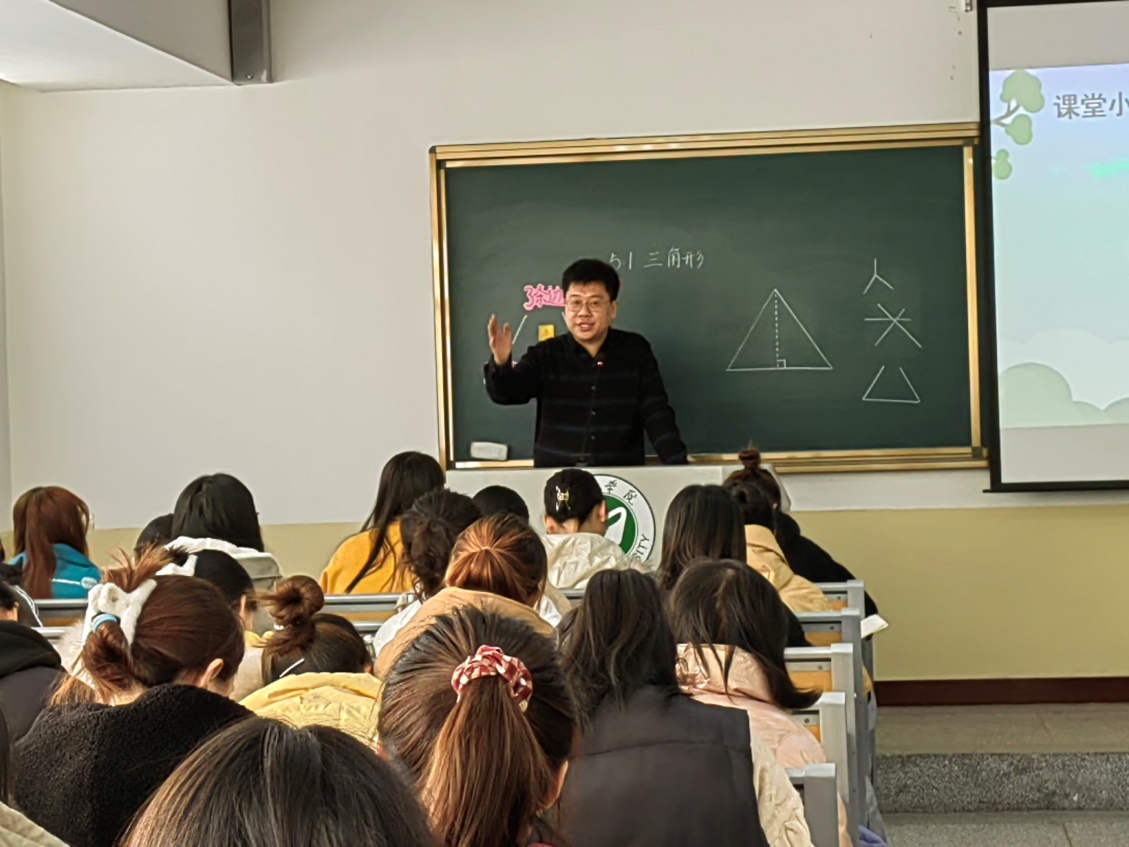 小学数学课程与教学的实训教学课堂上,两位同学先后模拟教学了小学数学教学内容《面积的认识》《三角形的特性》。孙鲁老师对学生的课堂教学表现给予了较高评价认为同学们有较好的教学素质扎实的教学基本功,教学设计与实施比较到位。同时他也指出学生在教学内容的处理及重难点把握方面存在不足,希望同学们在解读教材方面再下功夫,并就《三角形的特性》做了教学示范。随后,孙鲁老师双减背景下,“强课提质”的路径进行了讲授同学们深刻认识到作为一名小学数学教师如何读懂学生读懂课堂,坚守课堂教学这个主阵地。