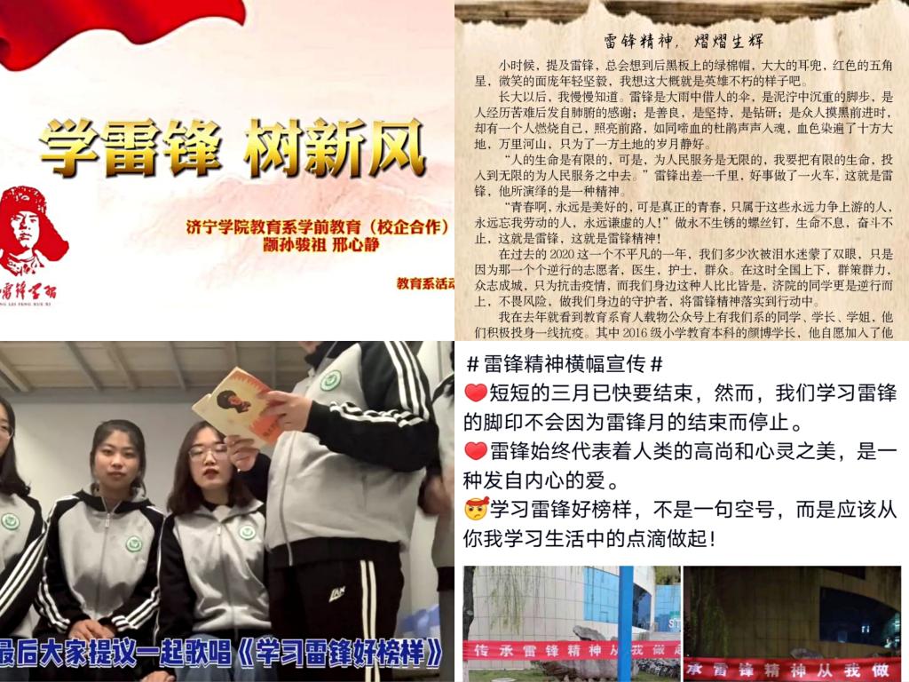 此系列活动由教育系团总支主办,系学生会学习部、文艺部、青年志愿者协会承办。学习部以“手抄报”和“故事会”的形式,表达对雷锋同志的缅怀与纪念,一张张手抄报美观整洁,体现时代内涵,一个个故事生动形象,讲好雷锋精神。“斯人已去犹忆影海棠花开魂依旧,文艺部以视频、征文、拍照的形式来缅怀雷锋事迹,照耀雷锋精神,同学们积极参与,记录践行雷锋精神的瞬间,彰显我校的团结友善。青年志愿者协会通过横幅张贴形式,广泛宣传雷锋精神的时代意义,大力倡导助人为乐、友爱互助的校园风尚,营造了浓厚的活动氛围。