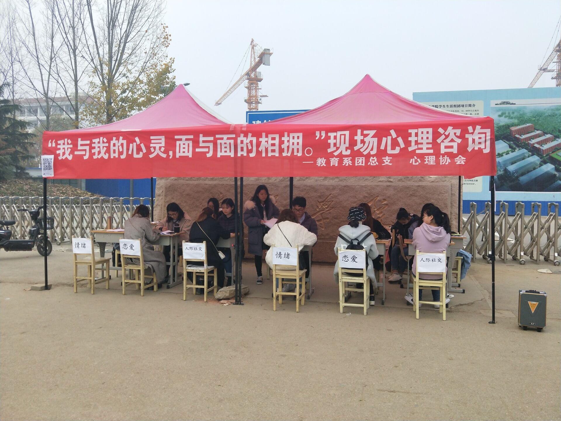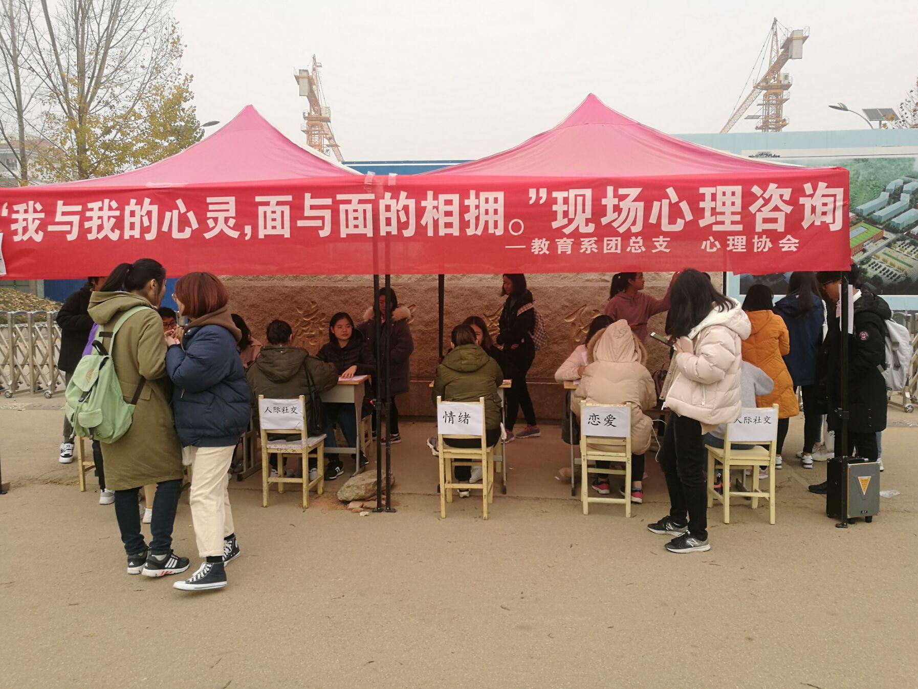 11月29日,由教育系团总支主办、心理协会承办的“我与我的心灵,面与面的相拥”现场心理咨询活动在我校北门举办。本次活动共计三百余人参加。