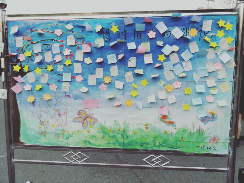 通过来访者的咨询,工作人员大体了解了大家比较关心的情绪情感方面的问题,为之后的工作提供了大致的方向。大家踊跃的把自己的生活问题、心理状态以及想对自己或对陌生人想说的话都写成便利贴贴在展板上,无形之间释放了大家的心理压力。