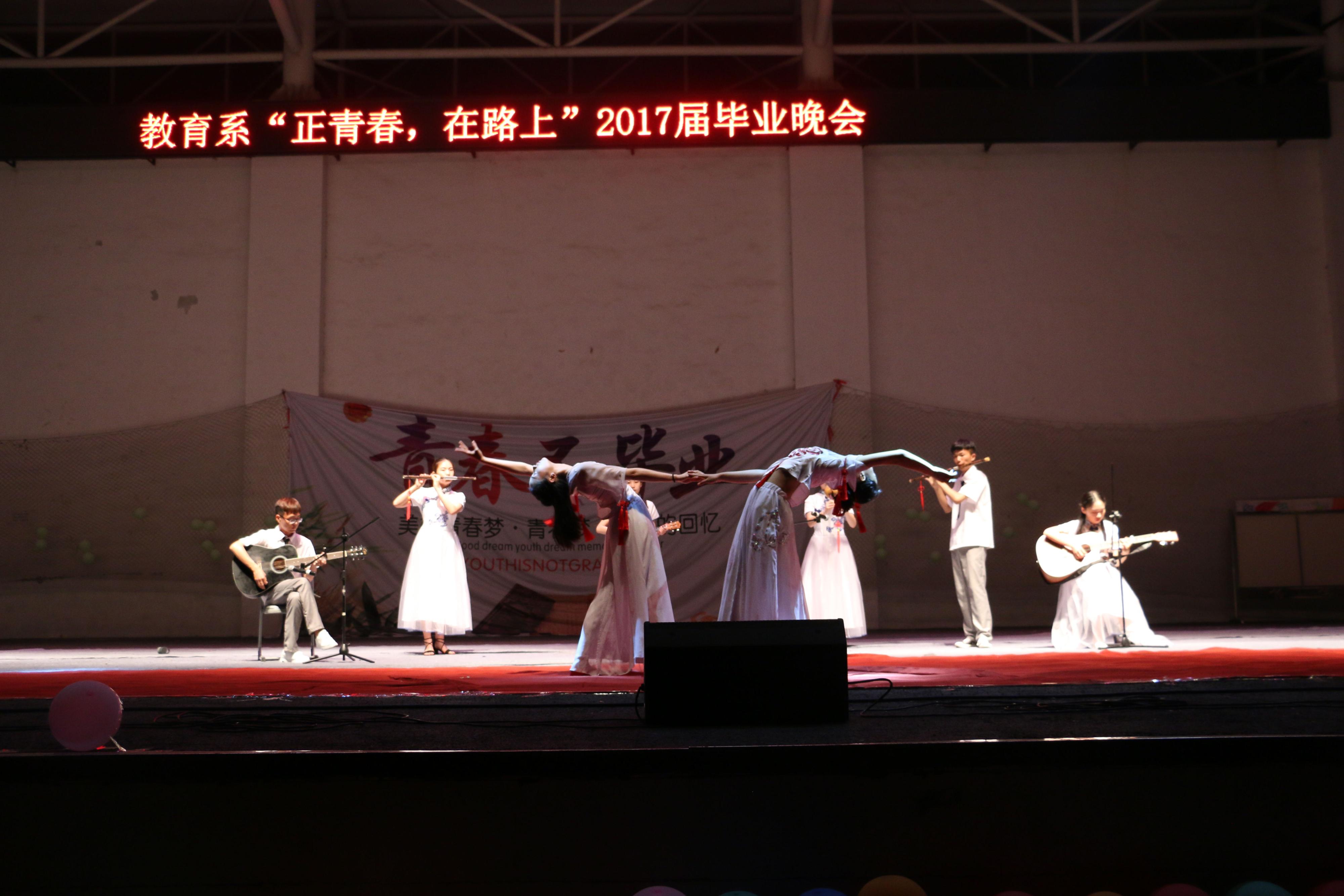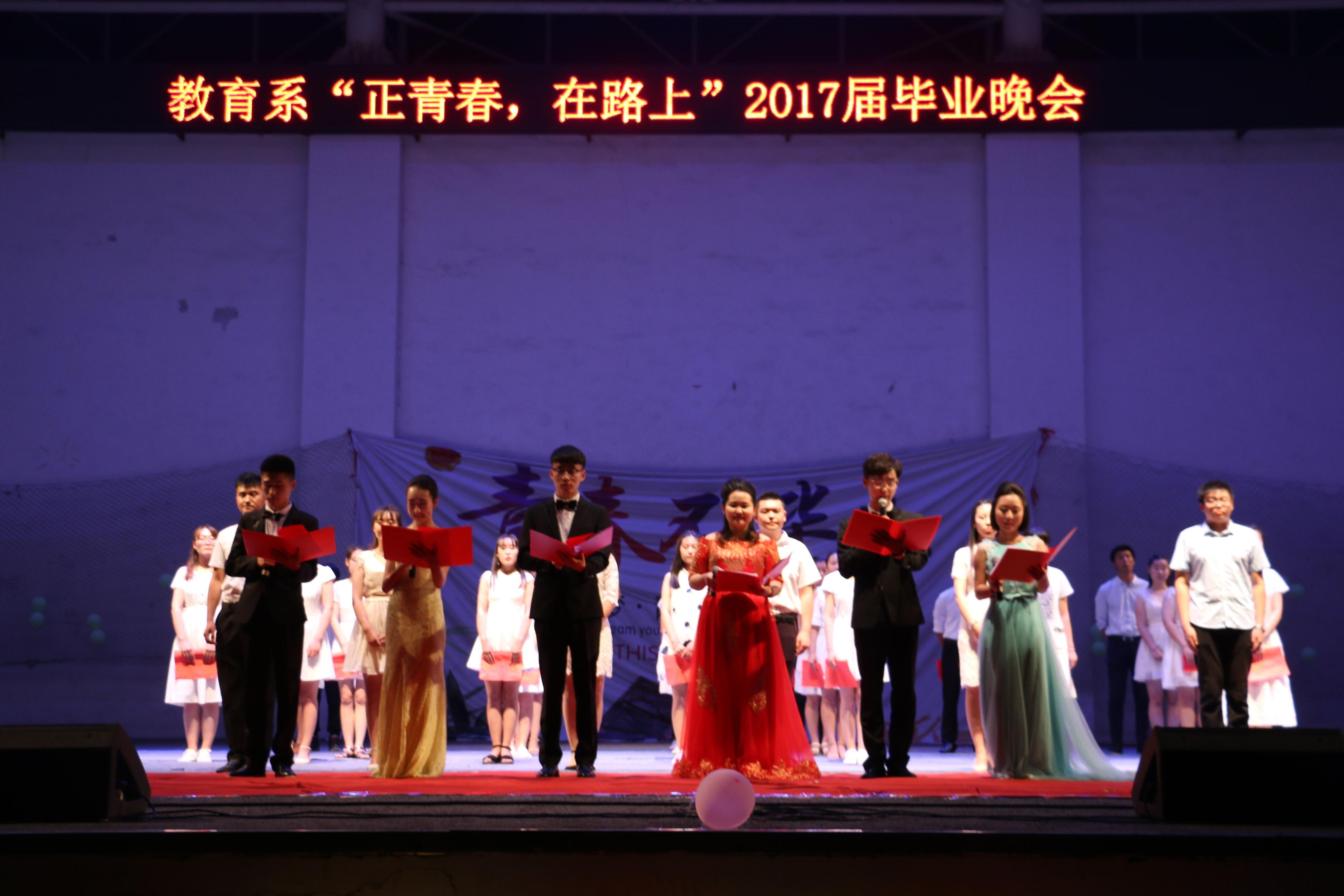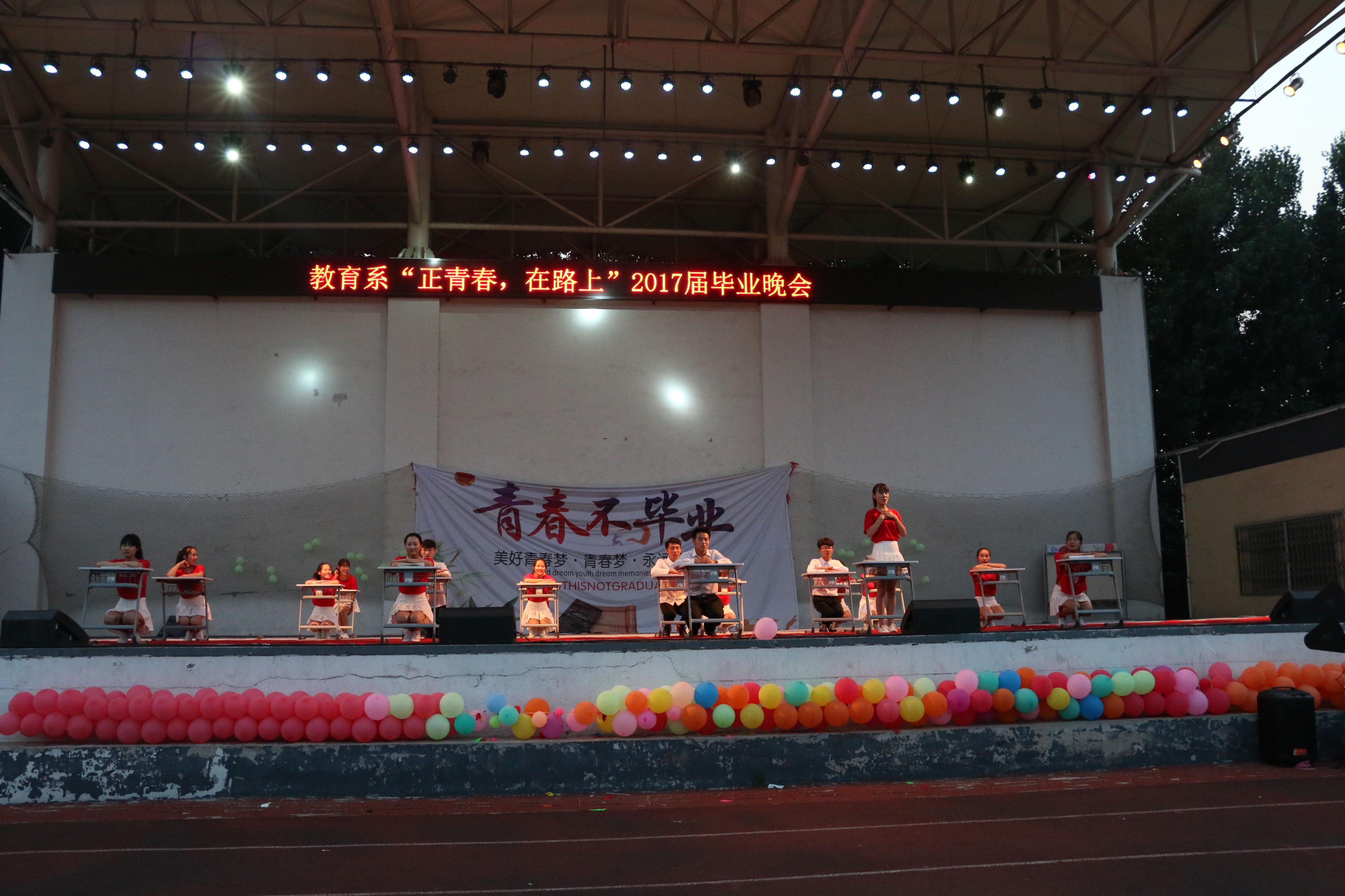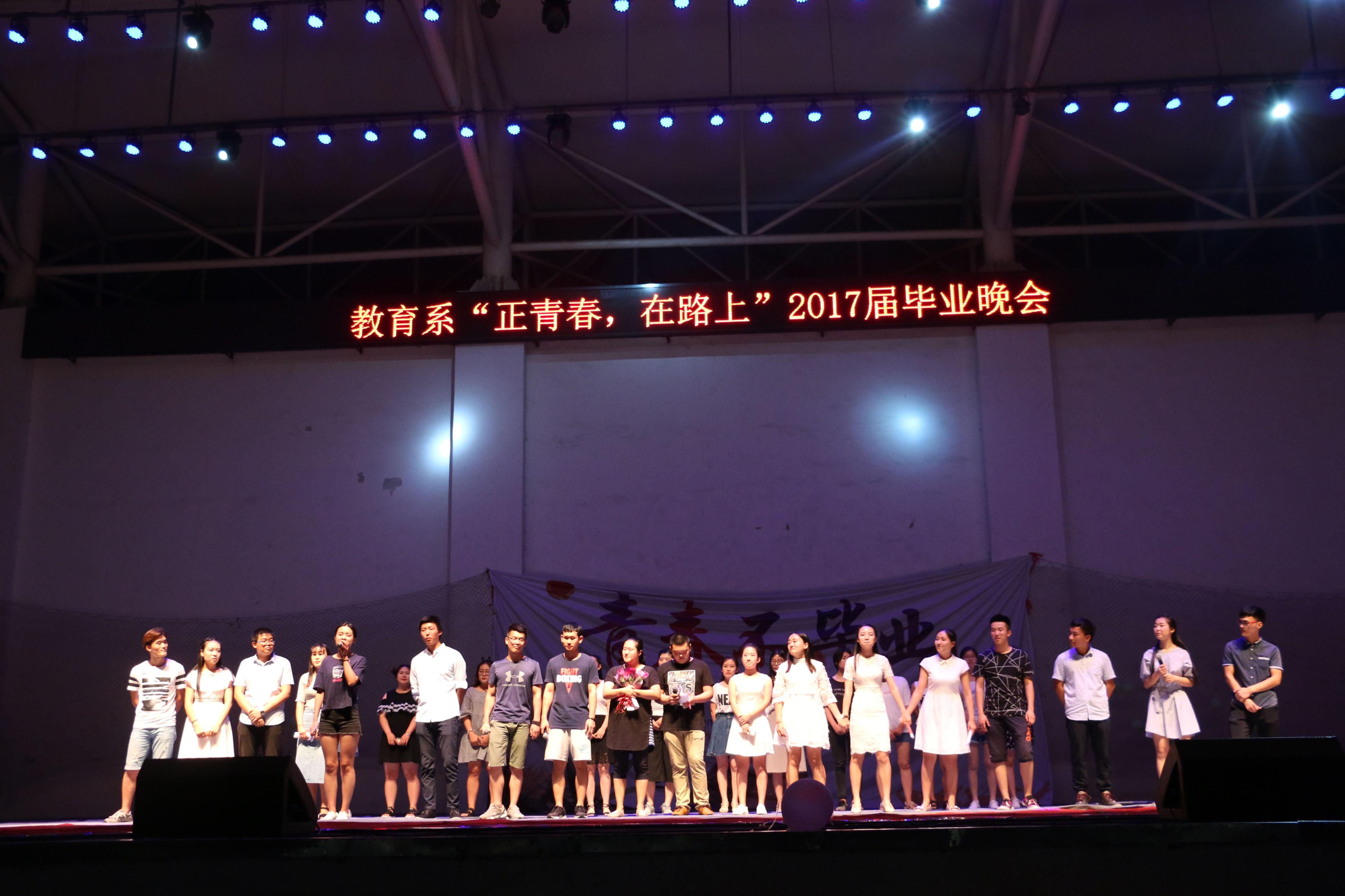2017年6月15日晚6时30分,由教育系团总支主办、教育系学生会承办的“正青春 在路上”教育系2017届毕业晚会在西操场举行。出席本次活动的有教育系主任李群,教育系党总支书记乔东华,教育系副主任张邦伟,教育系党总支副书记刘勇等老师。