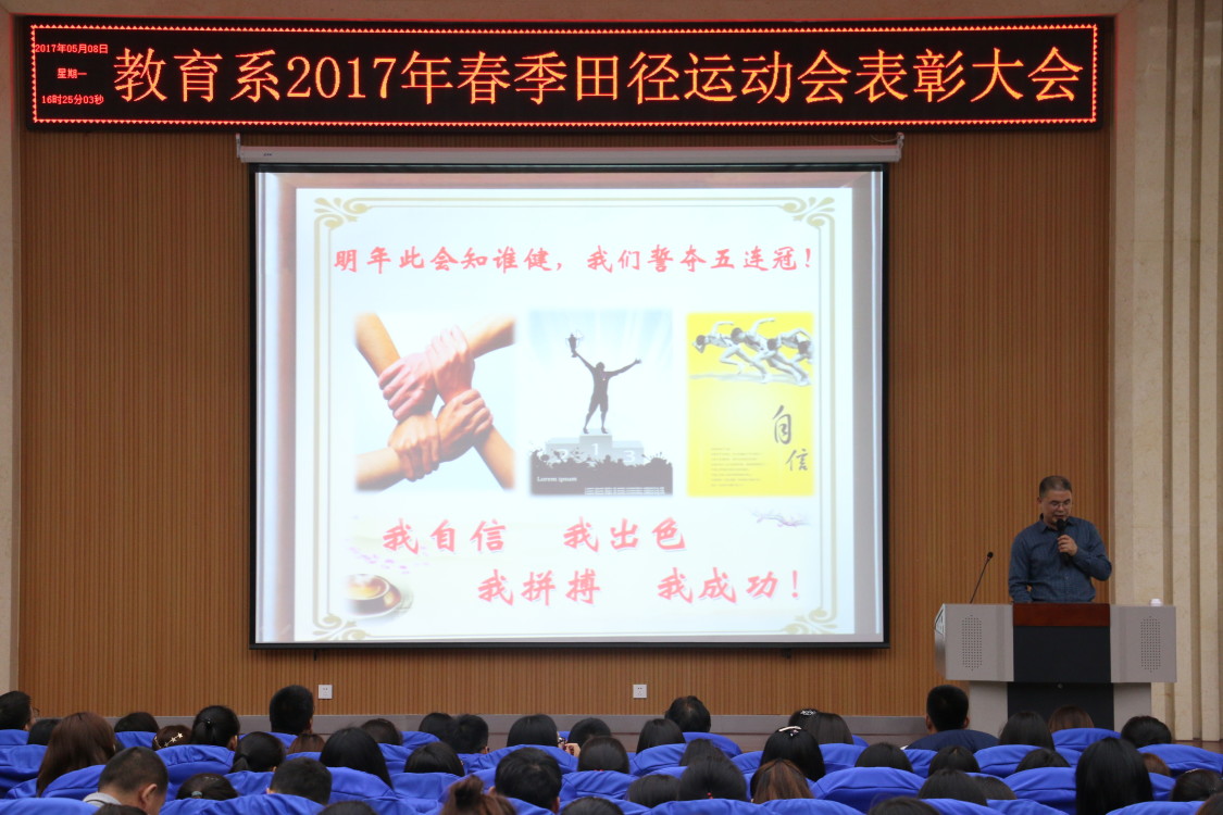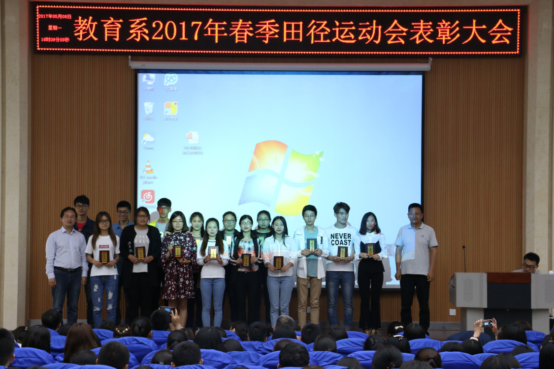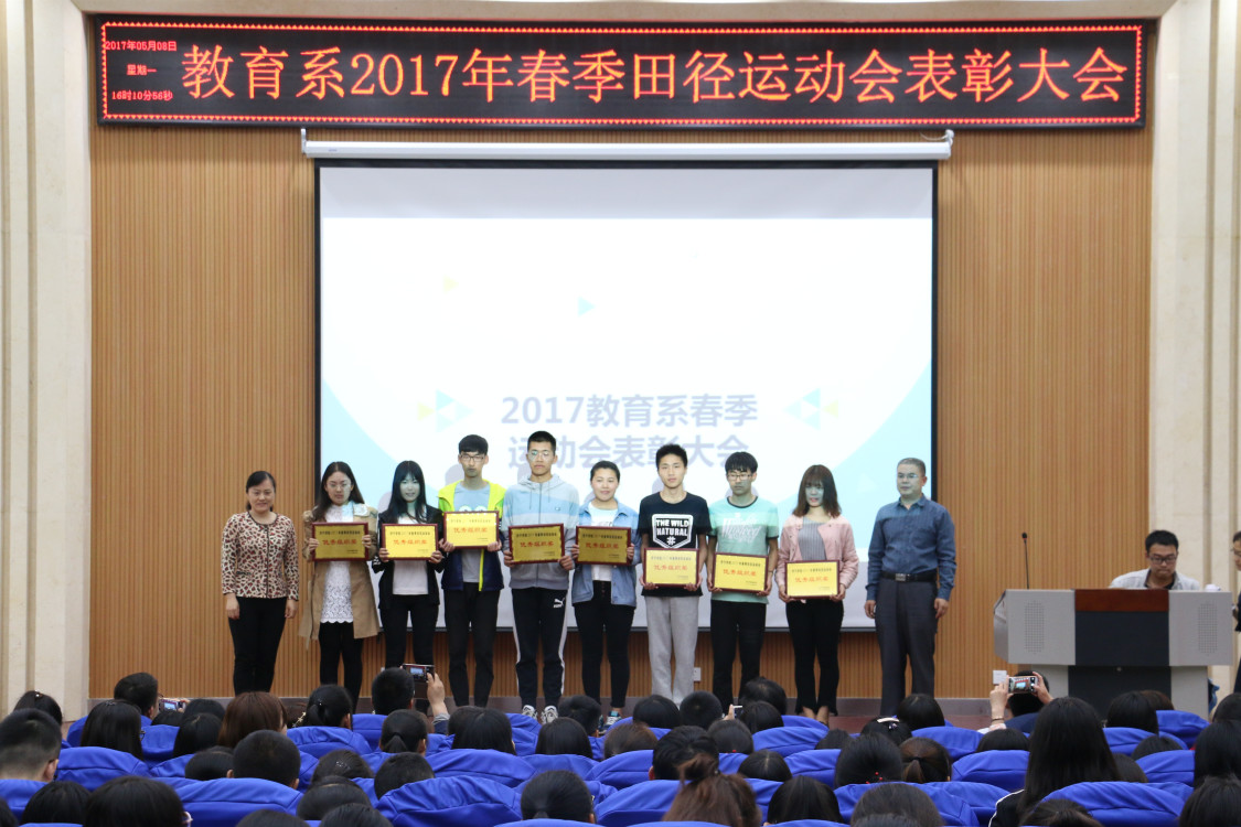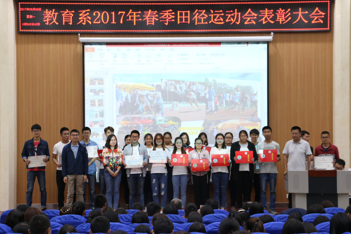 2017年5月8日下午4时,教育系2017年春季田径运动会表彰大会在经管系报告厅顺利举行。教育系党总支书记乔东华,教育系主任李群,教育系党总支副书记刘勇,教育系副主任张邦伟,教育系团总支书记单清清,教育系教学秘书贾英侠,教育系辅导员齐文强、岳现超、徐艳艳,教育系教师储旭等出席了此次表彰大会。