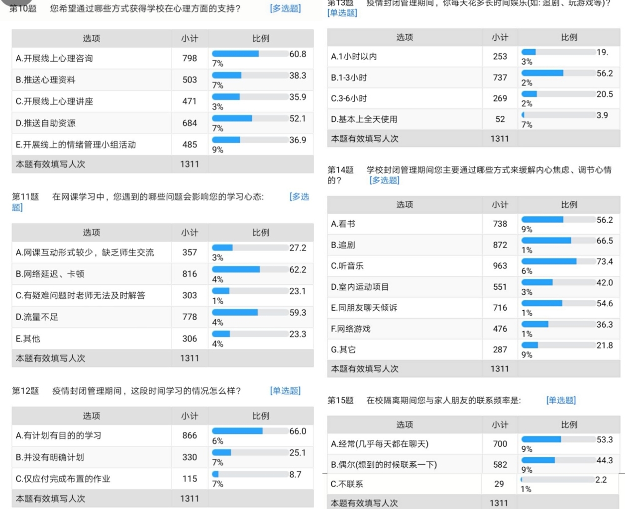 本次调查围绕疫情防控期间同学们的情绪调控、行为习惯、线上学习心理需求及人际交往等五个方面展开,全院1300余名学生参与了线上问卷调查。调查结果显示,大部分学生能够以健康的心态和积极的行动应对本次突发疫情,懂得珍惜学习生活,珍爱生命。但在近一个月的疫情防控期间,部分同学也表现出情绪低落、心理焦虑等不同程度的情绪和心理问题,需要辅导员、任课教师持续关注其学习和生活动态,做好疫情期间学生心理疏导工作,为同学们筑起一座坚实的心理堡垒。