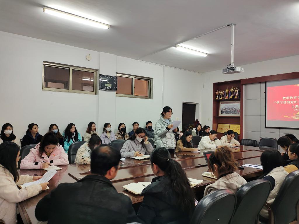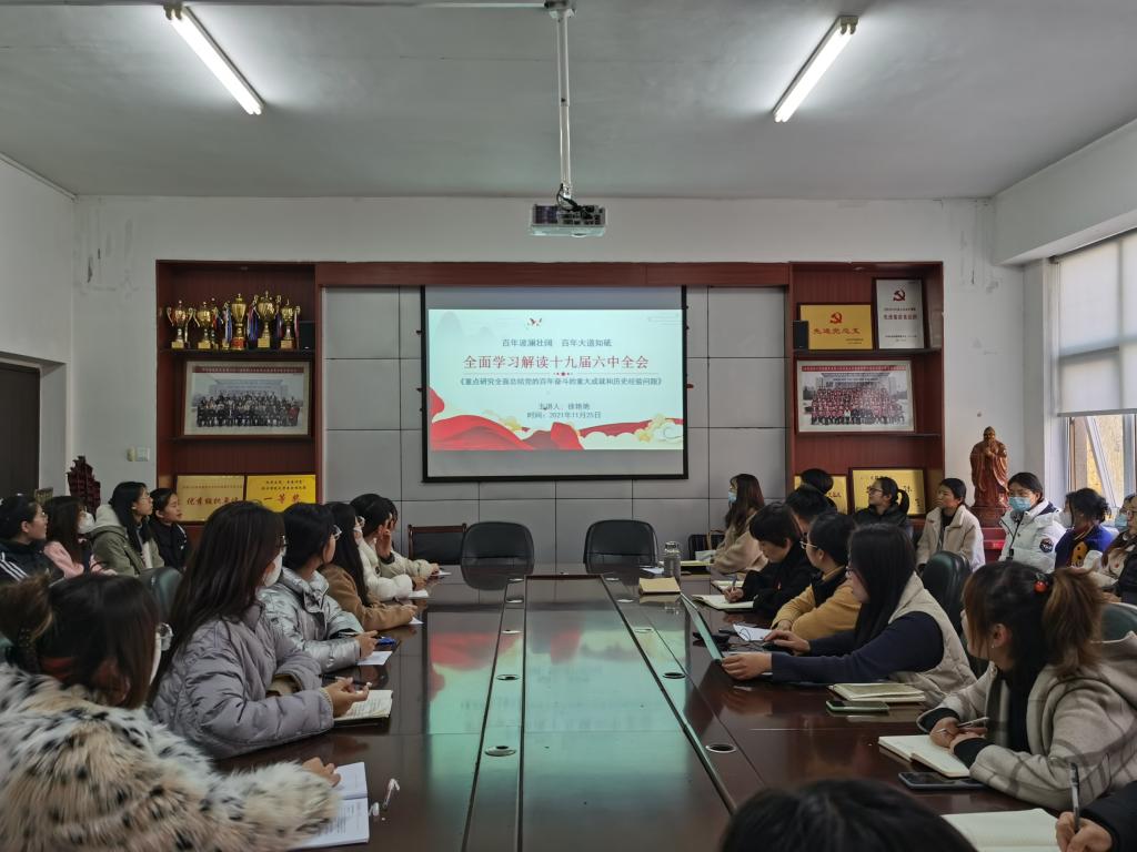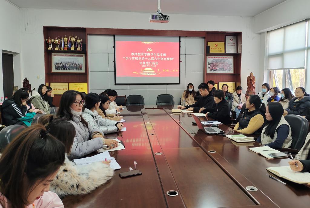 11月25日下午,教师教育学院学生党支部在学院会议室开展了“学习贯彻党的十九届六中全会”主题党日活动。学生党支部书记杜鹃主持活动。
