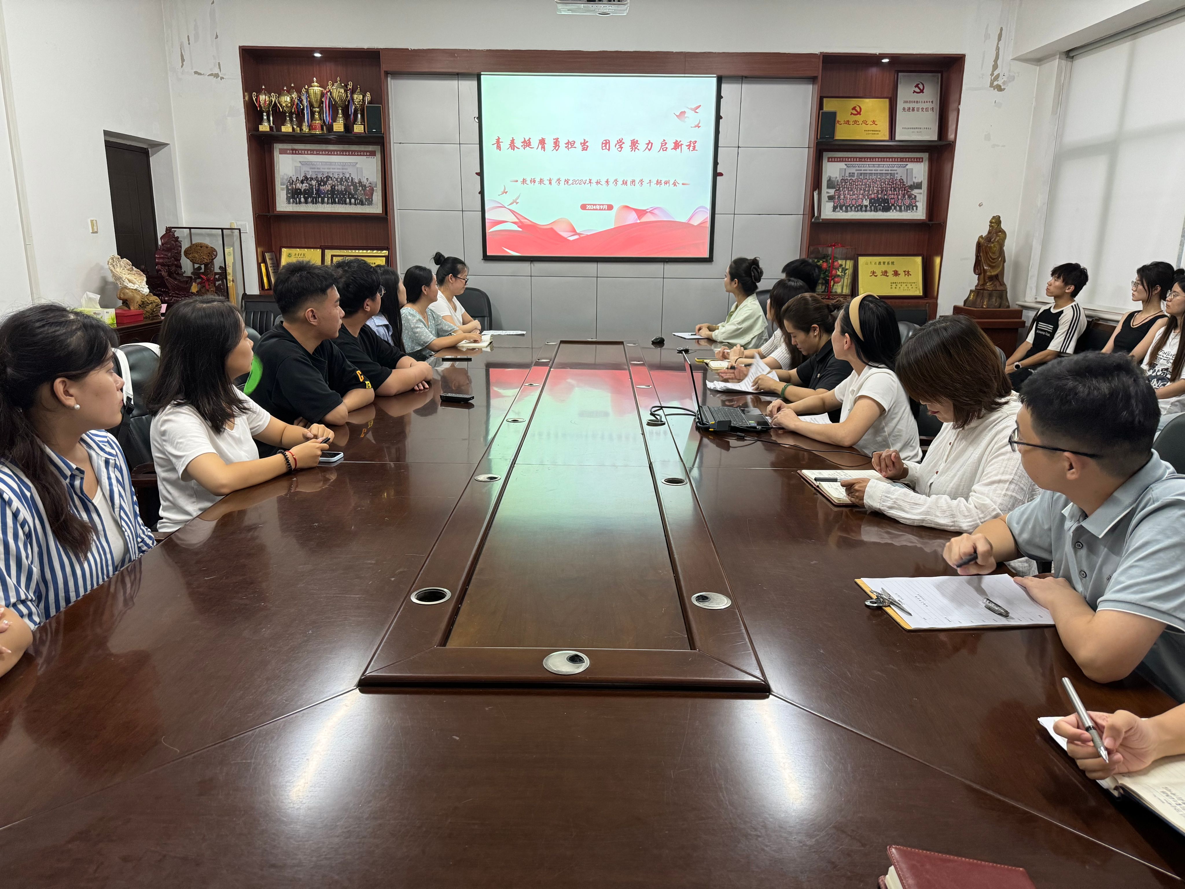 为进一步加强学院学生干部队伍建设,提升学生管理工作水平,增强学风班风建设,统筹规划新学期工作重心和发展方向,9月19日下午,教师教育学院在2号楼A211召开2024年秋季学期团学干部工作会议暨开学第一堂团课。该院党委副书记杜鹃、团委书记徐艳艳、全体辅导员及2023届团学干部参加。