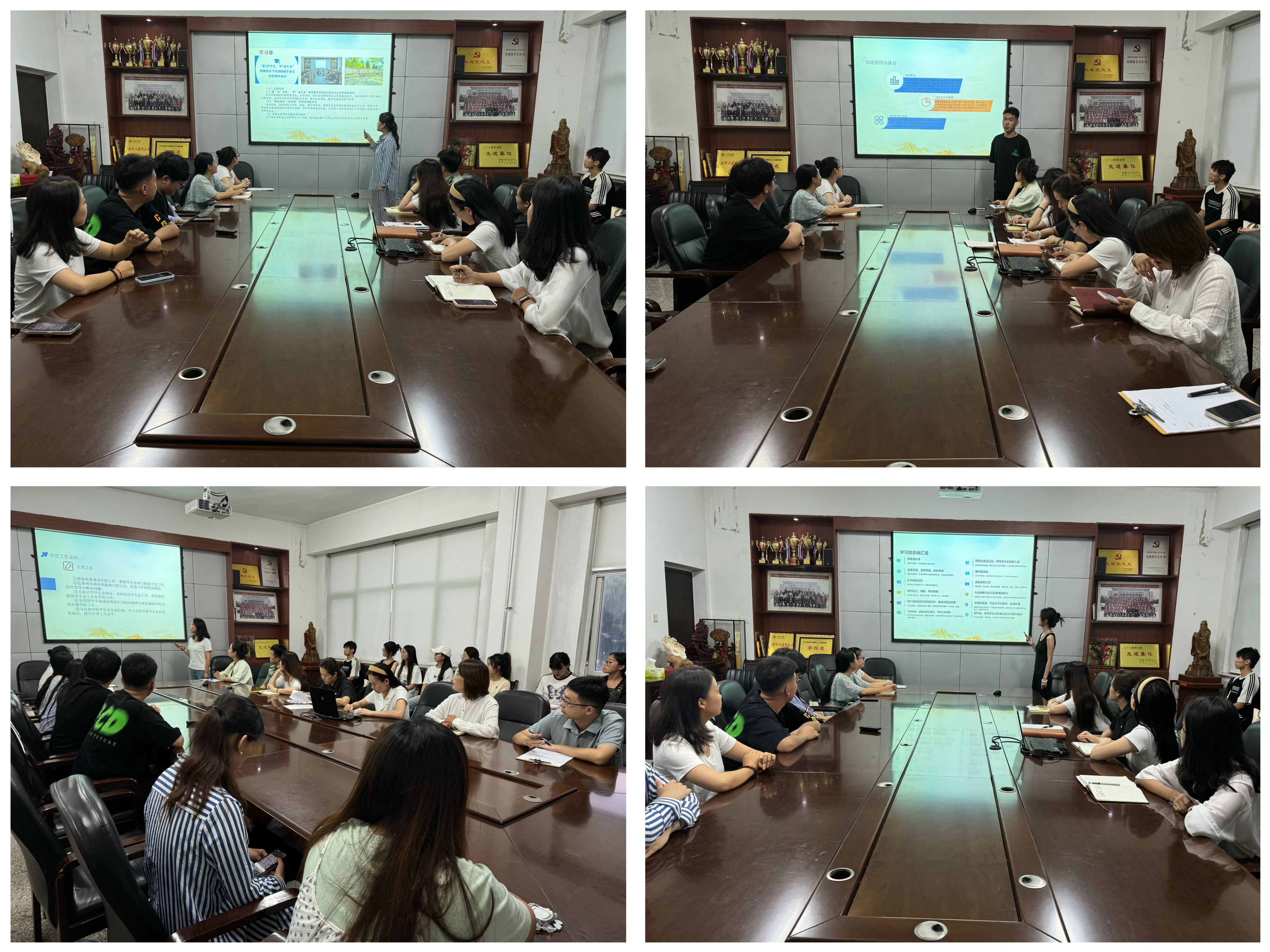 杜鹃对上学期的团学工作给予充分肯定,并结合新学期工作需要,对大家提出四点希望:第一,明确角色定位,提高政治站位;第二,做到想干、会干、干好;第三,增强服务意识,提升服务能力;第四,及时自我反思,学会凝炼总结。随后,学生会主席团及各部门代表围绕工作内容、工作成效、未来展望等方面进行工作汇报,既突出部门的工作亮点,也对工作中的不足进行了反思总结,并提出下一步的努力方向。