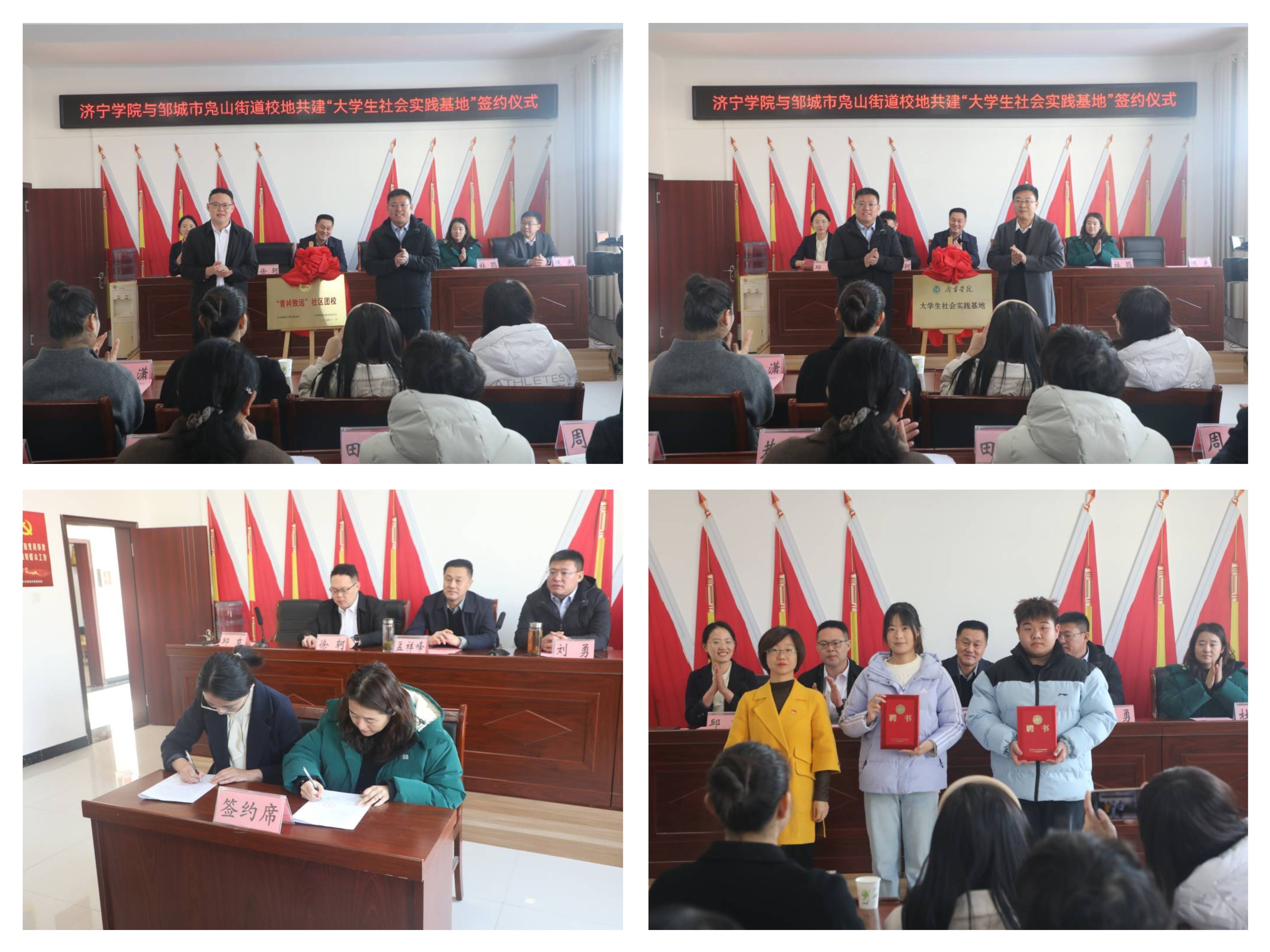 揭牌仪式上,刘勇和徐轲共同为“青衿致远”社区团校揭牌;杜鹃和邱爽签署社会实践基地共建协议书;刘勇和陈光共同为大学生社会实践基地揭牌。张莘为济宁学院教师教育学院2名学生代表颁发社区兼职团干部聘书。